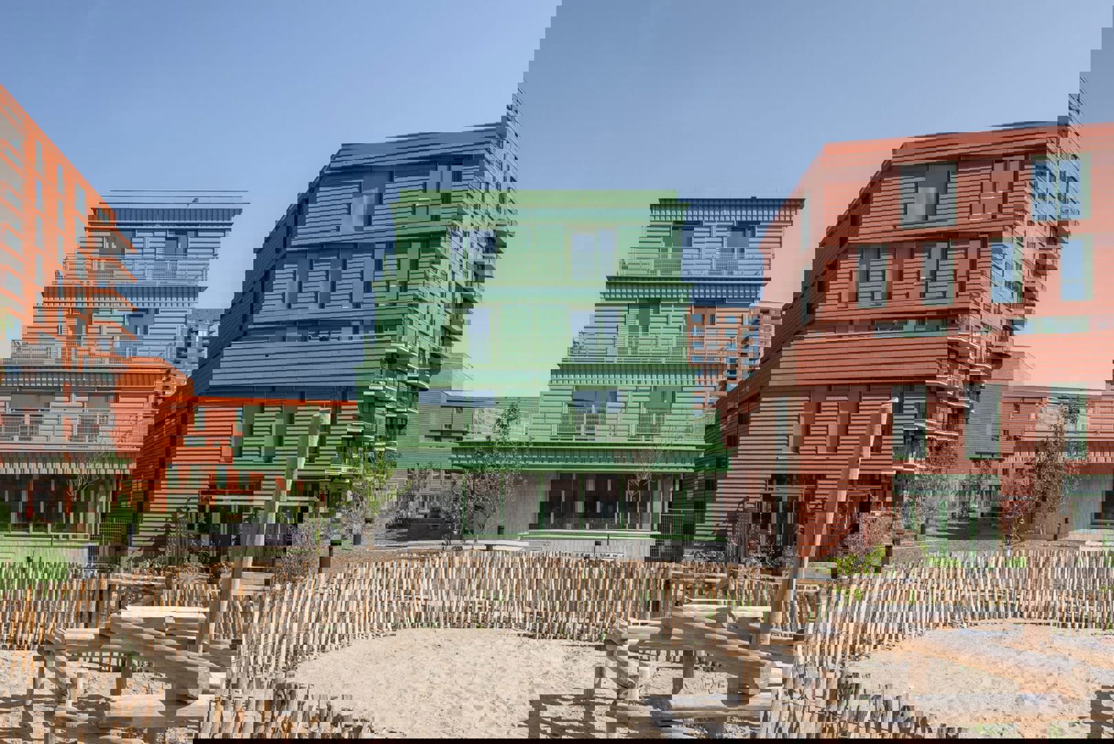 Les maisons ont été revêtues de panneaux de façade en acier de réemploi provenant de Van Engeland de Groot, avec des fenêtres assemblées par emboîtement, rabotées et repeintes par CirQ Wood et Kiewit.
