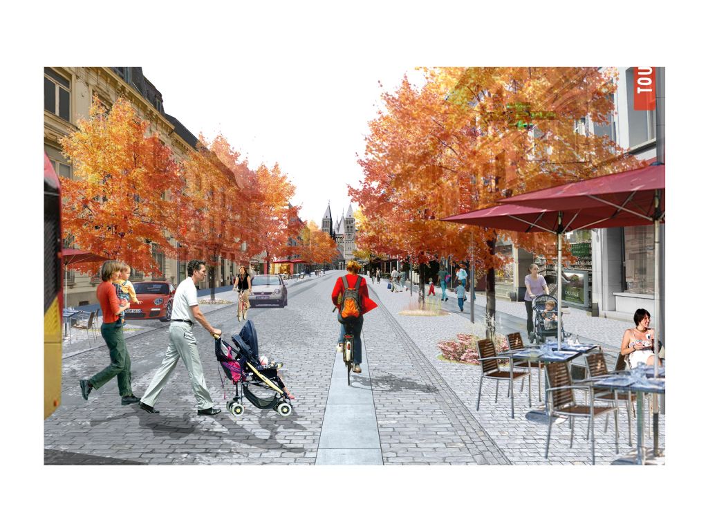 La rue Royale est rendue plus attractive pour les habitants, les commerçants et leurs clients ainsi que tous les usagers de la ville. L’aménagement proposé est sobre mais ambitieux via l’utilisation de pavés en porphyre et de béton coulé (coffrage glissant). La circulation piétonne est continue sur l’ensemble de la rue. Rue royale et place Crombez, les aires de stationnement sont des espaces voulus flexibles grâce à l'absence de denivellation ou de bordure entre le trottoir et la voirie. Ça peut être une place de stationnement, une terrasse agrandie d’un café, une extension des frontages des commerces... La récente réouverture de l’horeca dans le contexte covid montre bien que les riverains se sont accaparés cette idée de surface flexible : construction de terrasses en bois,...