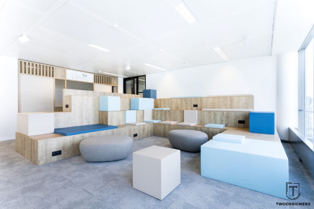 Le but était d’offrir un tout nouvel espace de travail afin que 50 à 80 collaborateurs puissent œuvrer dans les meilleures conditions possibles. L’objectif principal était de donner aux collaborateurs l’envie de revenir travailler plus régulièrement au sein de l’asbl. Twodesigners avait donc pour idée de développer un environnement de vie et de réflexion ergonomique, cosy et inspirant. L’agence a relevé le défi en aménageant un espace ralliant esthétisme, fonctionnalité et confort en intégrant, pour les équipes, entre autres, des espaces de réunion fermés, ouverts, d’isolation acoustique (pour les appels téléphoniques par exemple), ainsi que des salles de formations polyvalentes et créative, ou encore une cuisine.