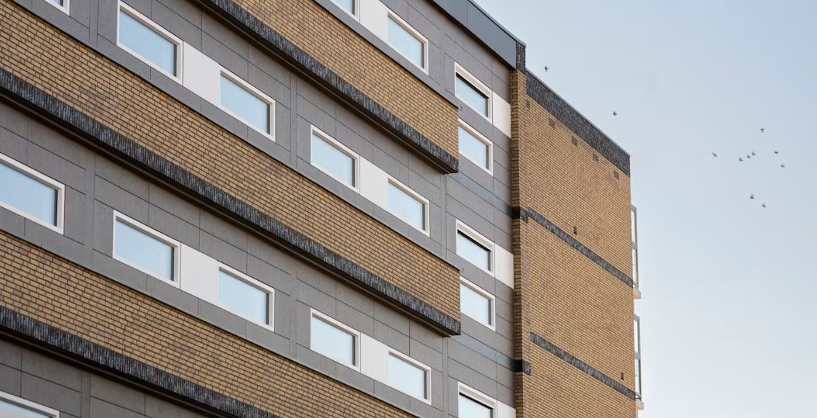 Appartements-foyers délabrés transformés en complexe d'appartements modernes grâce au bardage Rockpanel.