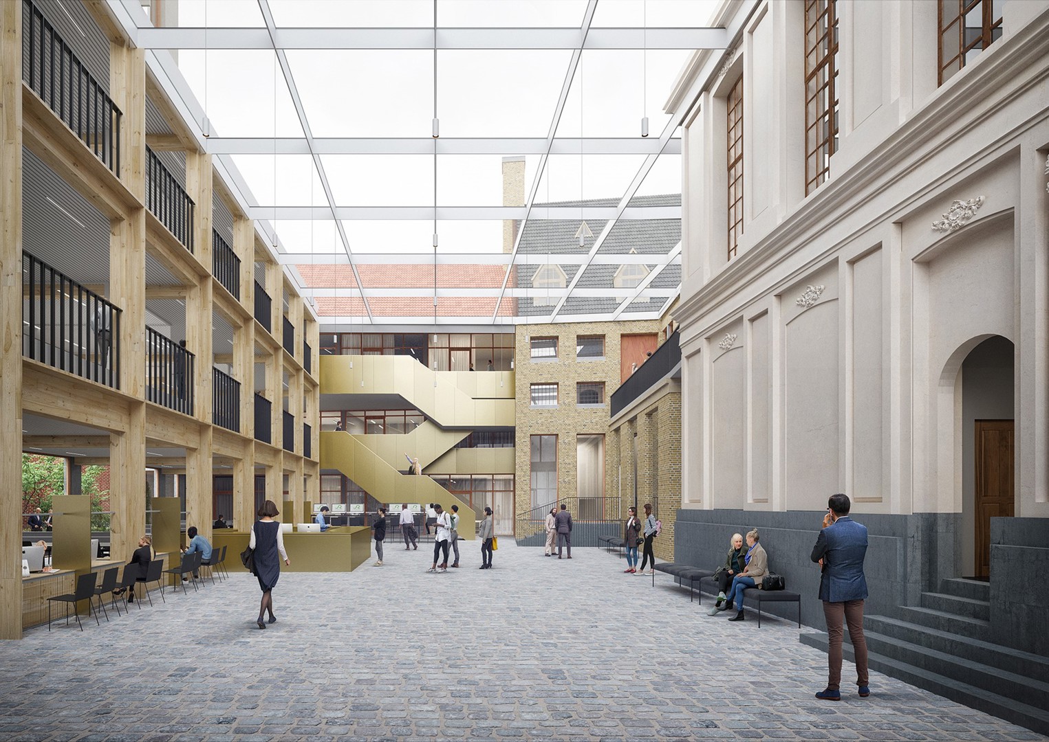 L’hôtel de ville existant sera entièrement restauré et un nouveau bâtiment sera construit le long de la Botermarkt. Une salle ouverte centrale reliera les bâtiments historiques et la nouvelle construction.
