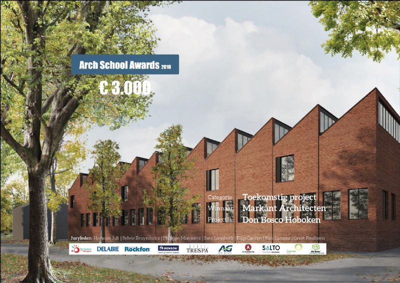 L'Arch School Award 2016 de la meilleure rénovation/extension est allé à Architecten Groep III pour son projet ‘Basisschool De Horizon’ à Koolskamp. Le jury relève le fait que ce projet, réalisé en DBFM dans un véritable 'bled', contribue à la renaissance de tout un village. Architecture soignée et ludique. Intégration réussie d'espaces verts, d'un potager, d'un compost et d'une toiture végétalisée. L'Arch School Award 2016 du meilleur futur projet a été remis à Markant Architecten pour le projet 'Don Bosco Hoboken’. Le jury a particulièrement apprécié le caractère industriel du bâtiment qui témoigne du respect de l'architecture présente sur le site.