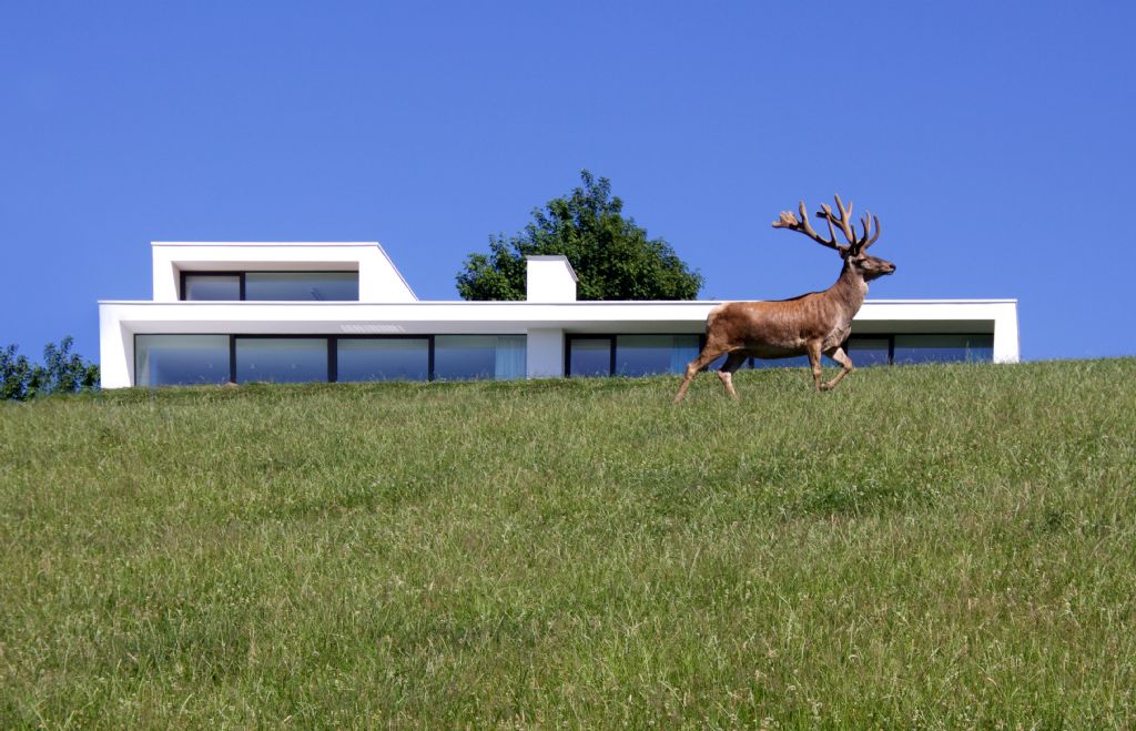 La partie professionnelle est accessible directement depuis la route par une porte en verre translucide, soulignée sobrement d’un cadre en aluminium. Elle se compose d’un hall d’entrée avec vestiaire et toilettes, ainsi que d’un spacieux bureau profitant d’une vue remarquable. La partie privée de la maison est accessible par le niveau inférieur. Les portes coulissantes et parois de verres offrent intimité à la maison, tout en laissant pénétrer la lumière du sud. Les différences de hauteurs de plafond permettent de répartir la cuisine, la salle à manger et le salon dans un seul espace ouvert sur le paysage. L’espace nuit est isolé du séjour par une porte acoustique. La buanderie et la salle de bains des enfants sont placées côté rue, alors que les chambres profitent du jardin. Au bout du couloir, la chambre parentale comprend en plus du lit, un coin douche, une penderie et une baignoire lumineuse. Le garage et les caves permettent de dissimuler à la vue, les nombreux objets non indispensables à la vie de tous les jours, ainsi qu’un espace de détente.