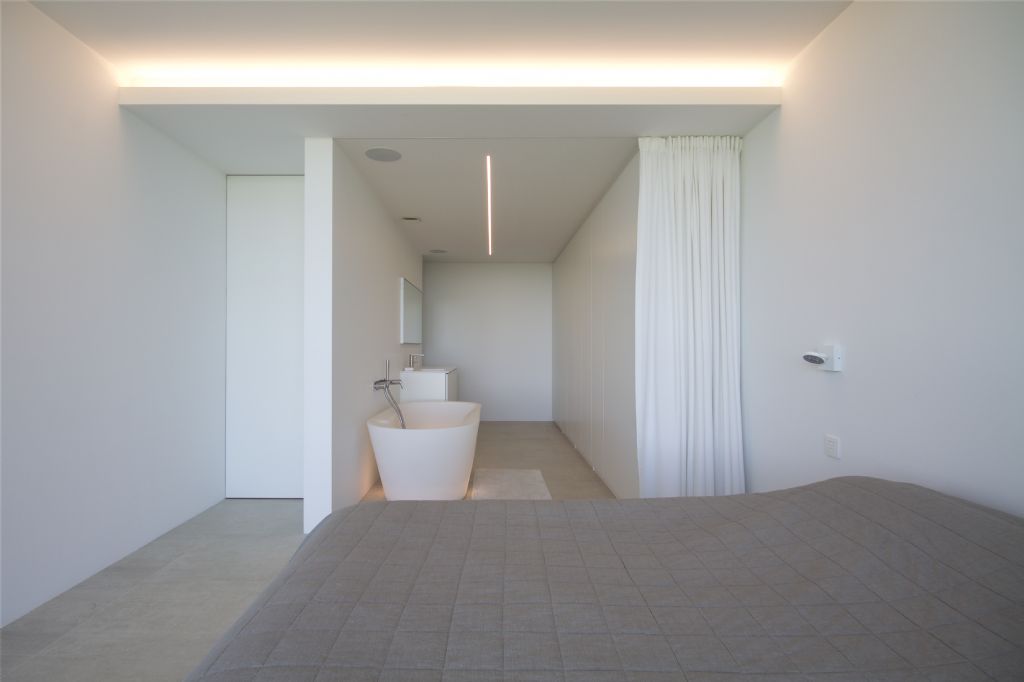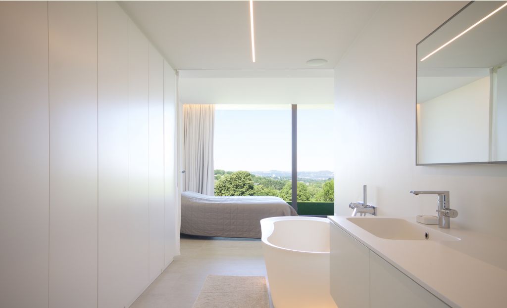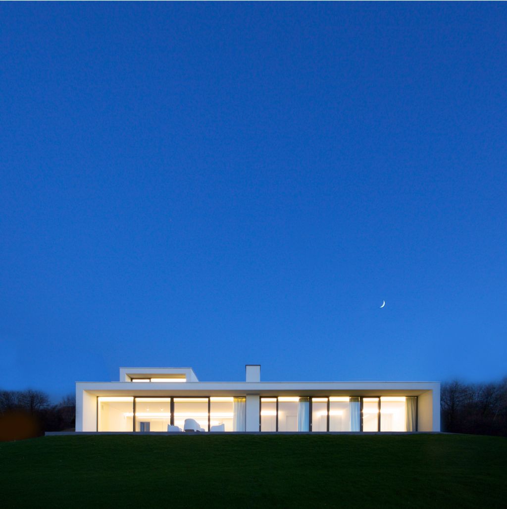 Toutes les pièces de vie sont situées de plain-pied à un niveau inférieur par rapport à la route. Elles se prolongent vers l’extérieur par un débordement de toiture, au travers d’une façade entièrement vitrée, donnant sur une spacieuse terrasse. Seule la partie bureau au niveau supérieur est visible et accessible depuis la rue. La vue pour les piétons reste ainsi dégagée, minimisant l’impact de la maison dans son environnement. Les matériaux sont sobres, homogènes, minimalistes. Seuls trois matériaux sont utilisés à l’extérieur : le crépis blanc pour les façades, l’aluminium pour les menuiseries extérieures et bardages de la porte du garage, ainsi que la pierre pour les terrasses et aménagements des abords. A l’intérieur, le blanc domine majoritairement sur les murs et le mobilier intégré. Les autres matériaux présents sont clairs, lumineux et apaisants. Le projet se veut minimaliste et épuré, créant ainsi un environnement propice à la détente et au repos.