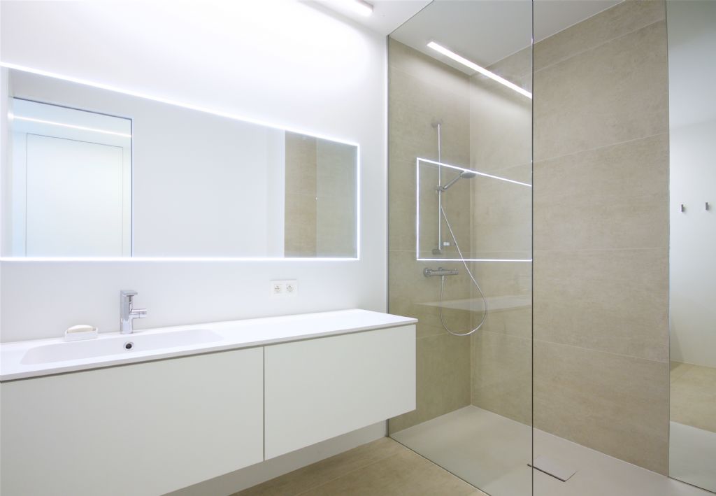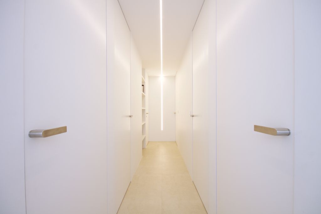 L’installation électrique a été pensée de manière à n’utiliser que des éclairages LED. Les luminaires, plafonniers et autres sont quasi inexistants. Les éclairages se font par des bandeaux LED ou des éclairages indirects intégrés aux meubles ou dans des gorges lumineuses. L’ensemble est géré par un système de domotique commandable à distance. La PAC air-eau amène les besoins calorifiques en hiver par un chauffage sol et un complément en chauffage mural dans les douches. Elle permet également de s’inverser en été et de faire circuler de l’eau froide dans les circuits afin de rafraîchir la maison par forte chaleur. La VMC assure la ventilation hygiénique du bâtiment en permanence tout en conservant les calories par un système d’échangeur de chaleur. Munie d’un by-pass, elle est dimensionnée afin de servir de free cooling pour profiter des températures nocturnes basses et rafraîchir la maison en été. Les panneaux photovoltaïques sont prévus sur la toiture du bureau afin de compenser les besoins en énergie des différentes techniques. Pour terminer, l’installation Hifi a fait l’objet d’un soin particulier. Les haut-parleurs sont intégrés dans les faux-plafonds ou murs du séjour et de la chambre parentale. Des haut-parleurs indépendants permettent d’écouter de la musique dans les autres pièces selon ses envies. Le tout contrôlé par une application sur tablette et smartphone.