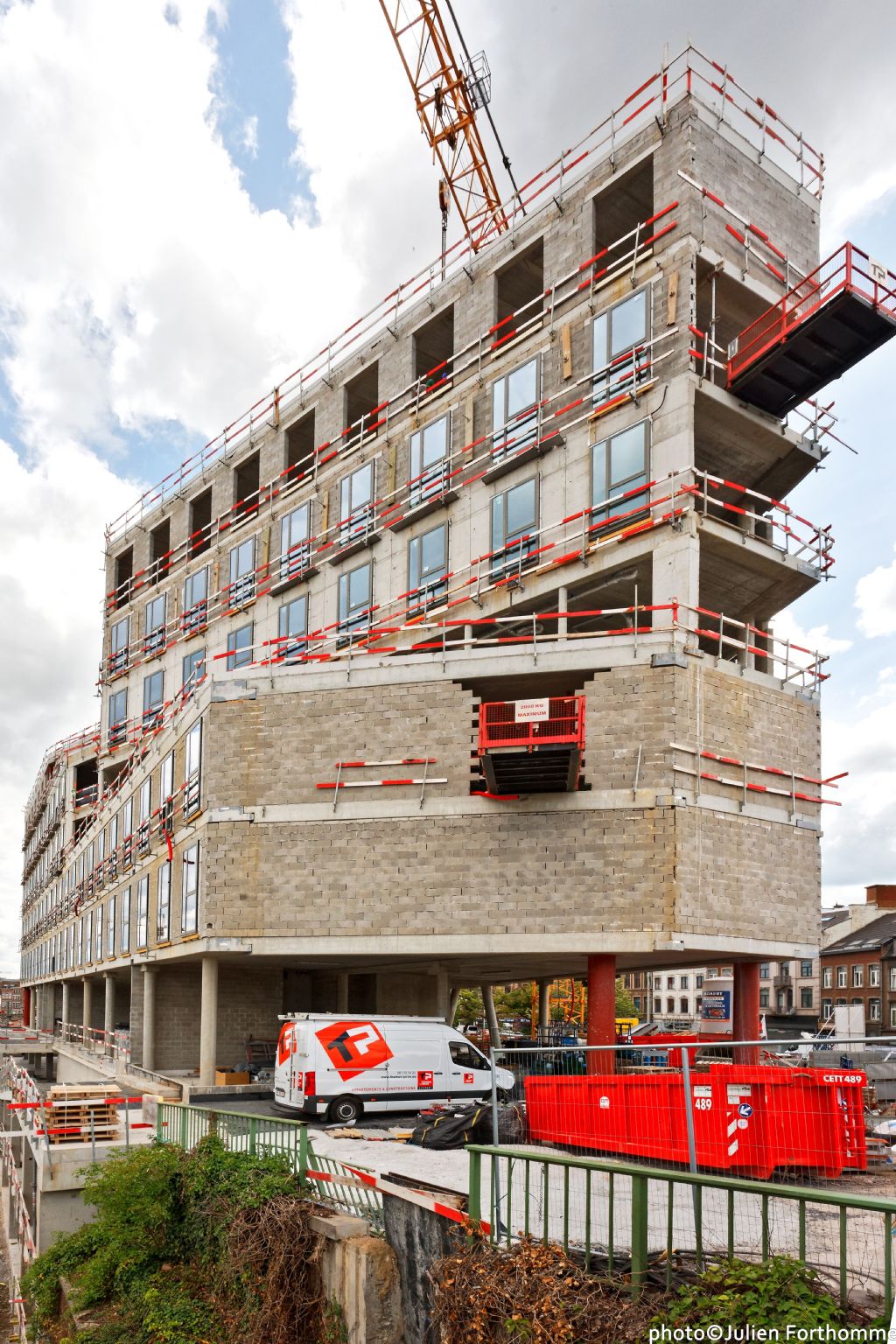Nous terminons le gros œuvre du centre administratif wallon de Belfius à Namur. Bien plus qu’un bâtiment de bureau, il marquera l’entrée du centre-ville. Ce bâtiment est implémenté entre les voies de chemin de fer et deux ponts routiers, ce qui fut un réel défi organisationnel pour l’entreprise de construction. A nouveau, ce bâtiment devrait marquer l’espace public, comme point de départ du quartier de la gare en plein réaménagement et donner un marquage fort pour l’entrée de ville.