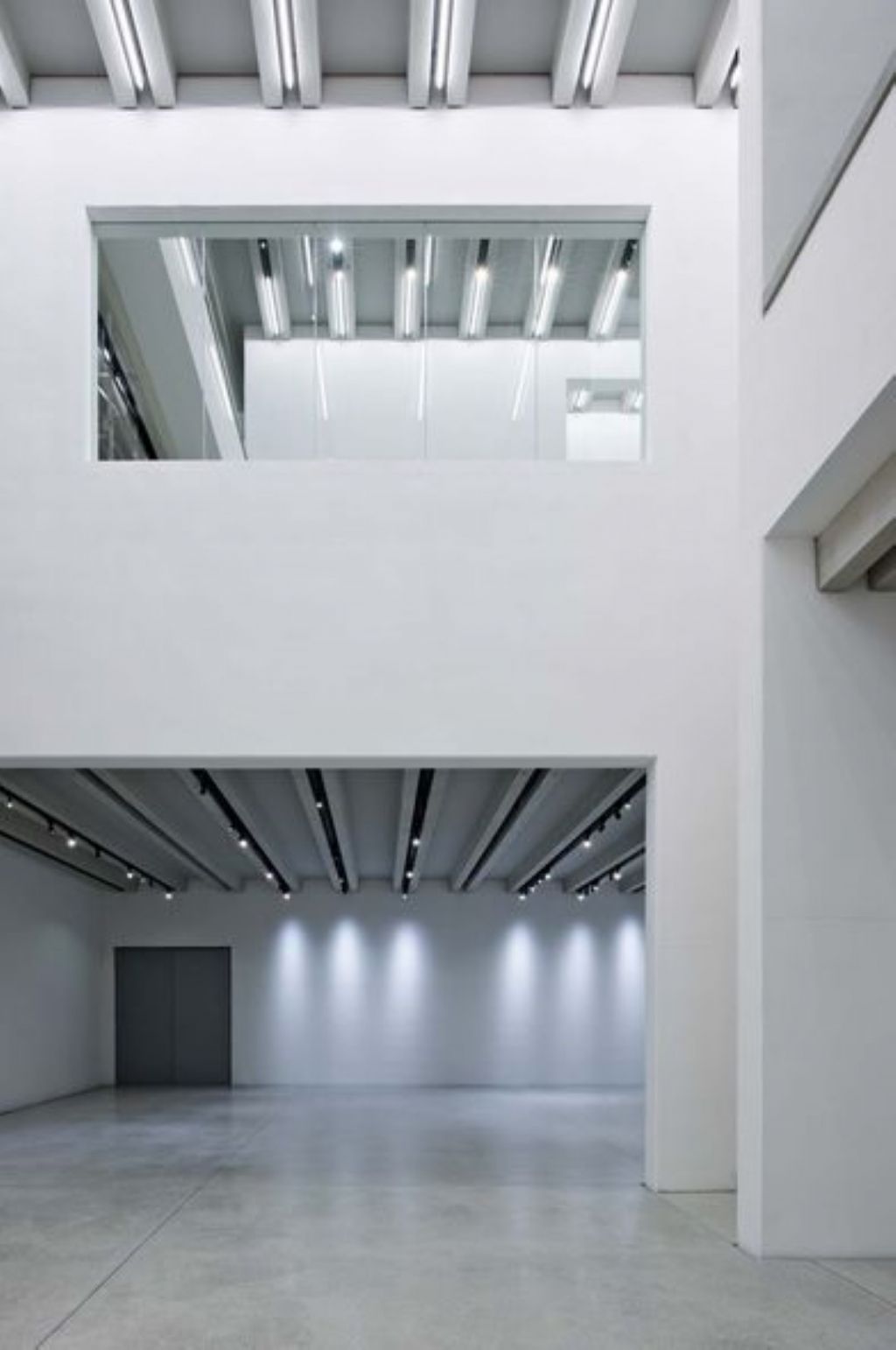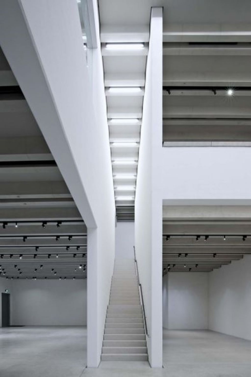 Les murs et parois de béton (composé à 50% de ciment blanc) ont été enduits de chaux brillante, ce qui donne un rendu immaculé et adéquat pour y exposer des œuvres d'art. Un sol en terrazzo gris joue le contraste avec la blancheur des murs et rejoint parfaitement les dalles de plafond en béton nervurées préfabriquées. Pour Heike Hanada, « les matériaux et les lignes du projets sont francs et correspondent à une réalité constructive évidente, celle de la culture sobre et objective de la construction industrielle. »
