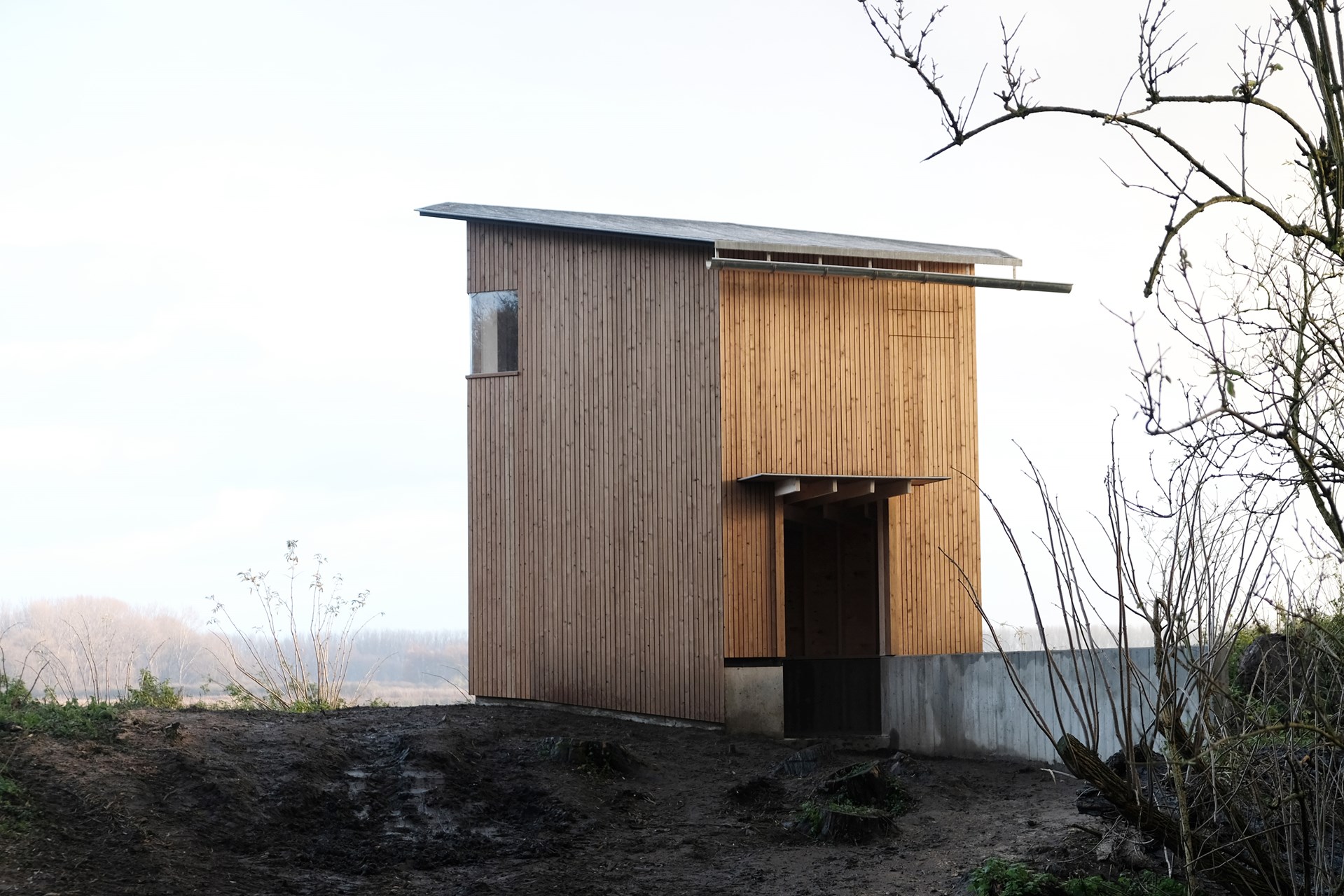 En approchant de l'observatoire, les visiteurs ont une perception en constante évolution du volume hexagonal irrégulier. Le côté le plus mince du volume passe presque inaperçu le long de la ligne de côte, tandis que le côté le plus large offre un abri pour s'approcher discrètement. La structure géométrique de la cabane est visible dans la structure de support en bois du plafond, qui s'étend subtilement pour marquer l'entrée avec un auvent. La lumière pénètre doucement à travers une fenêtre d'angle à l'étage : une invitation à monter l'escalier et à profiter de la vue à travers l'une des ouvertures.