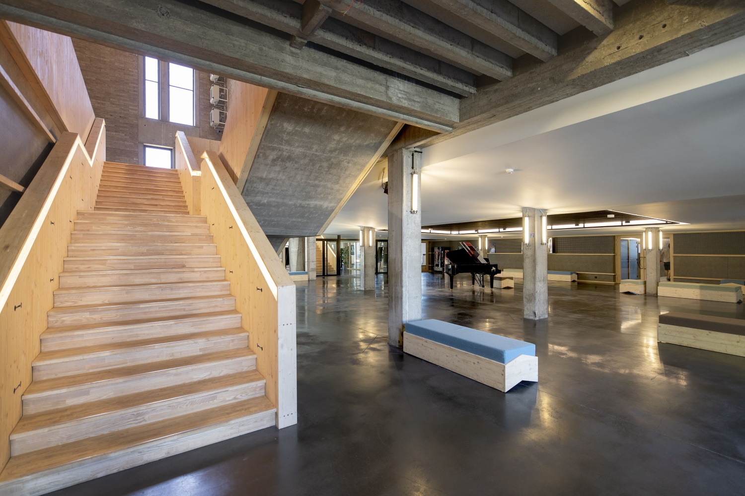 En pensant à l'avenir du bâtiment, Dial Architects a bouleversé toutes les circulations du Muziekcentrum de Courtrai pour mettre les rencontres au centre. Avec l'aide de Sileghem & Partners, Boydens Engineering, Studio Basta et Daidalos Peutz, ils ont choisi les matériaux naturels et les techniques durables appropriés pour rendre le bâtiment circulaire. Le projet est donc à juste titre l'un des sept prétendants au Circular Building Award des Belgian Building Awards 2021.