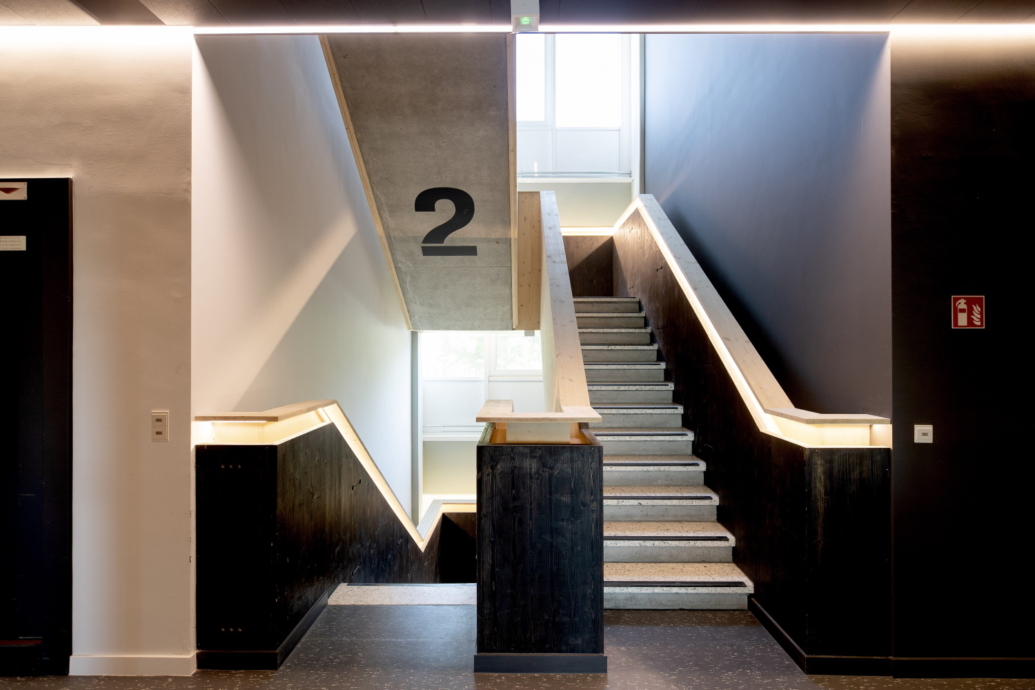 Ils ont ainsi pu s’appuyer sur la structure fortement répétitive du bâtiment. Par exemple, des panneaux duo insonorisants en magnésite de bois et en laine de roche sont suspendus en guise de plafond entre le squelette en béton. Les architectes ont réutilisé les plafonds existants de pièces qui avaient été entièrement rénovées en les appliquant dans les pièces où un élément du plafond avait été endommagé. Ils ont également créé une façade légère en verre et en bois et une façade modulaire à la hauteur de la plinthe, en fonction des dimensions disponibles du matériau de base. Pour cette dernière, ils ont utilisé des cadres en mélèze massif, finis à l'extérieur par un panneau de fibres de bois et un lattage en fraké thermiquement modifié, et à l'intérieur par un panneau de particules de bois pare-vapeur et un panneau de finition en fibrociment.
