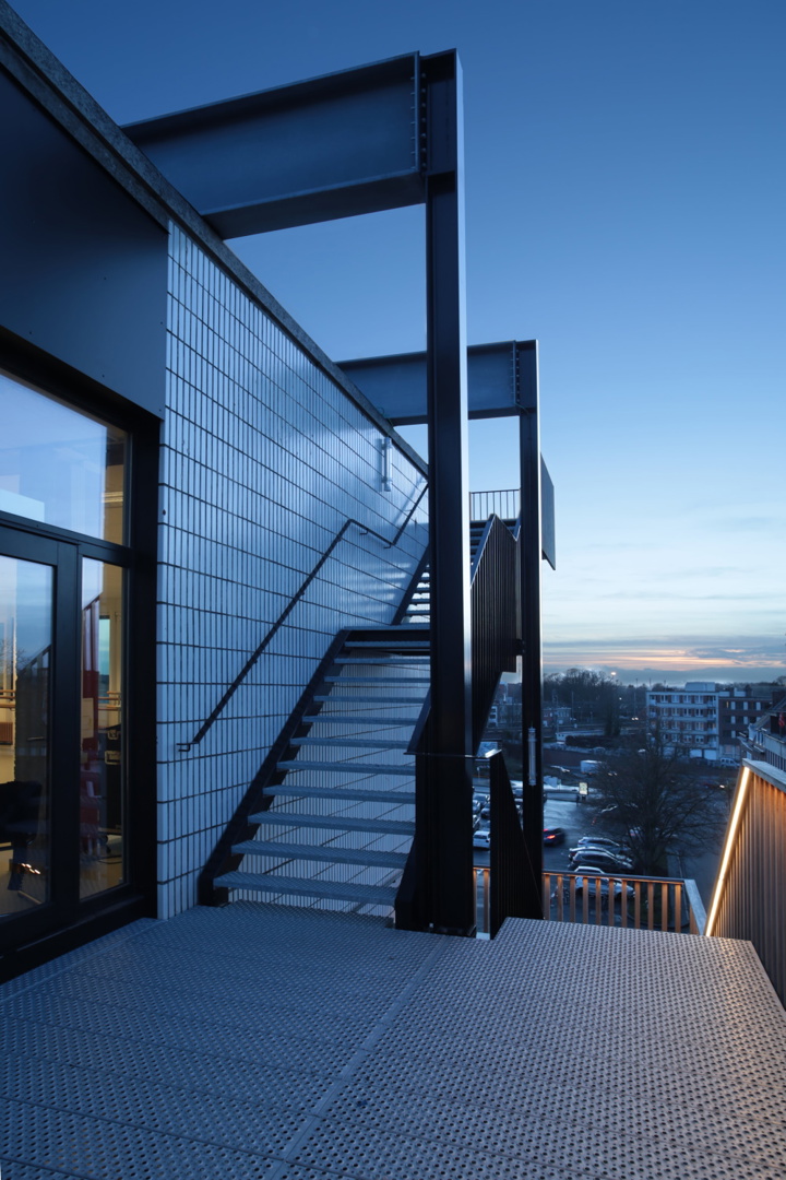 Dial Architects a également adopté une approche durable pour les techniques. Les nouveaux espaces, y compris l'auditorium et la réception, ont bénéficié d'une ventilation double flux et les toilettes sont alimentées par l'eau de pluie collectée. En outre, les architectes ont converti le bâtiment presque entièrement à l'éclairage LED avec un programme de ré-éclairage. Les planchers massifs et les sections de façade opaques empêchent la surchauffe et une bonne isolation rend inutile toute capacité de chauffage supplémentaire. Les salles de classe existantes ont été équipées de vannes thermostatiques et les stores ont été renouvelés. Toutes les entrées sont désormais également équipées d'un sas et de portes automatiques. Tous ces composants sont de plus reliés au système de gestion du bâtiment.
