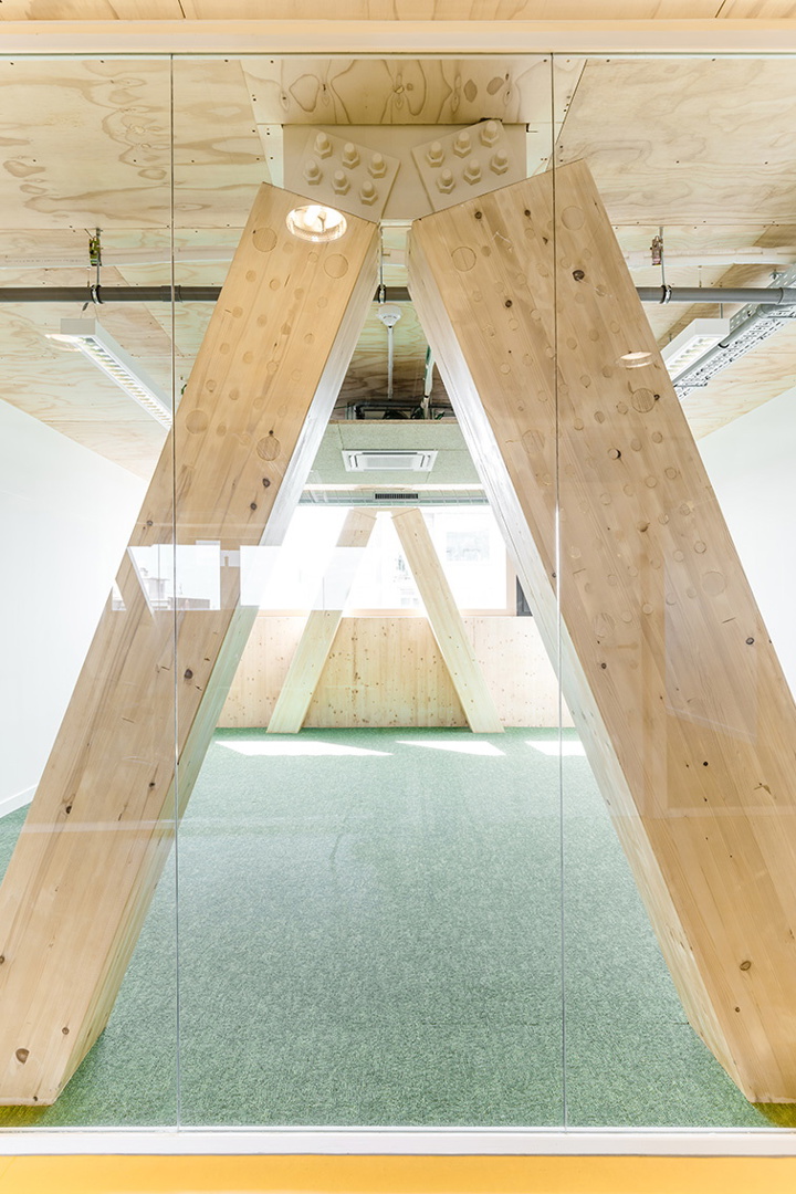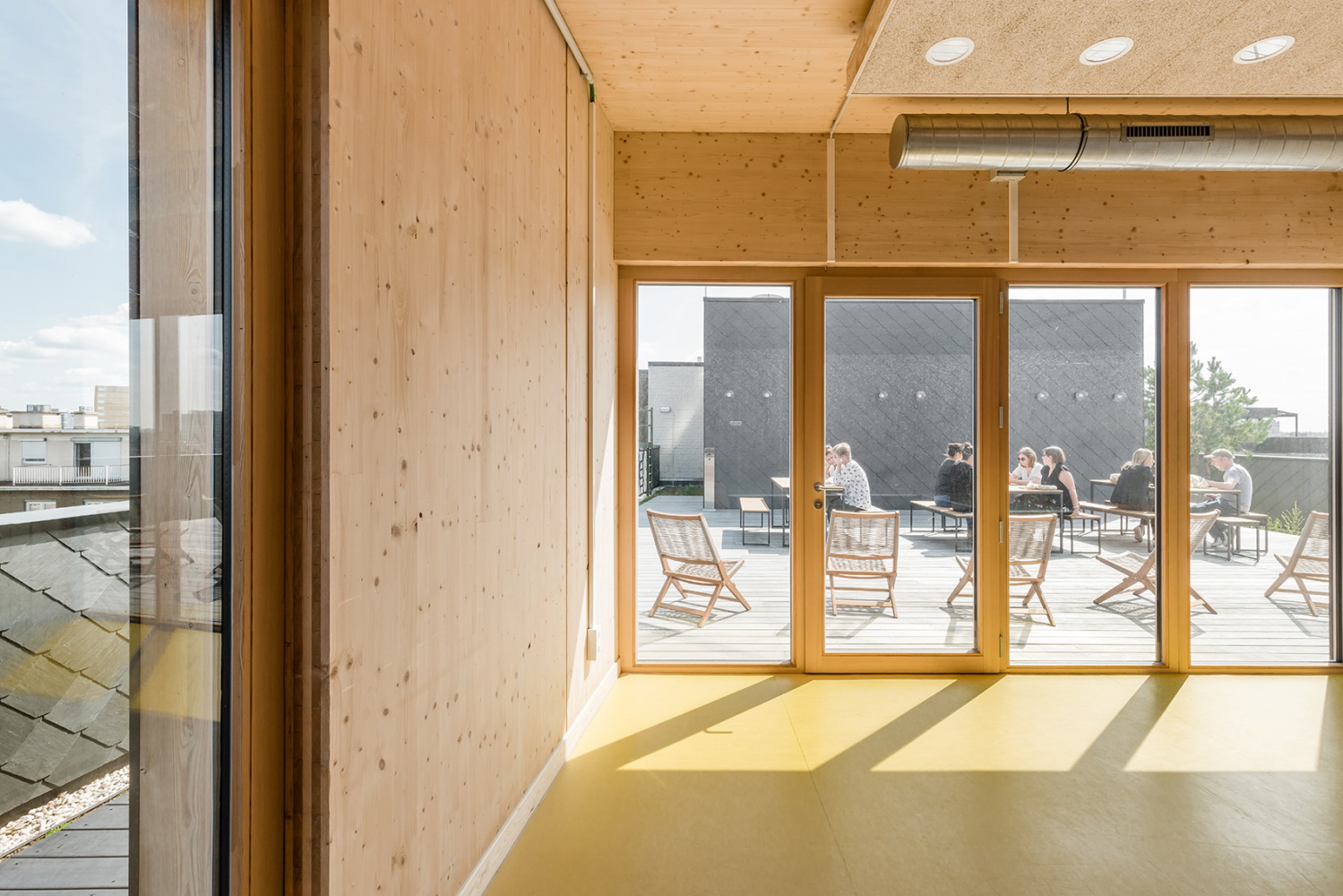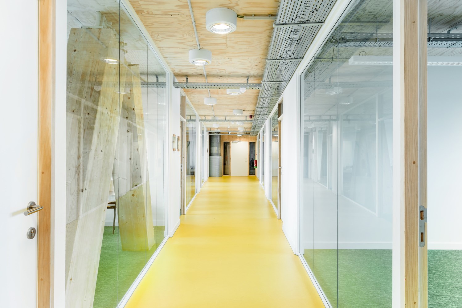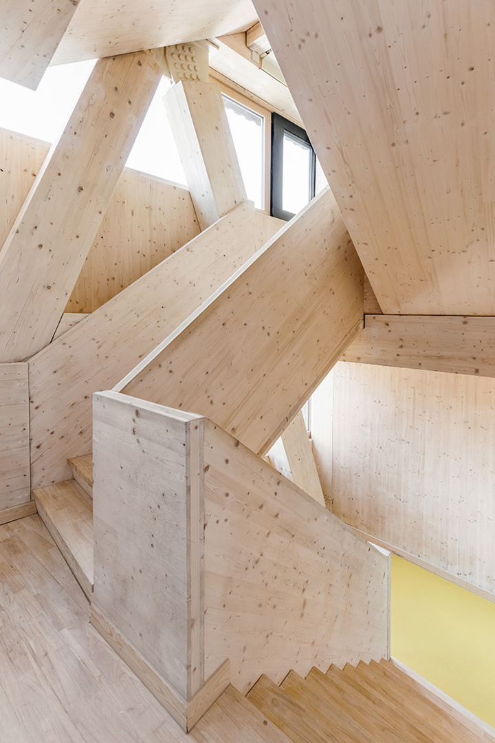 Les fermes treillis, qui forment la travée de trente mètres, sont remplies de planchers sandwichs en bois. Ces panneaux sandwich sont fixés mécaniquement aux fermes et leur épaisseur varie en fonction de la portée requise. La structure en bois, qui est laissée entièrement visible, donne lieu à une expérience unique dans le bâtiment. L'absence de finition des éléments structurels était un choix assumé, car les architectes ont pris de nombreuses décisions de conception en gardant à l'esprit le principe fondamental du "moins c'est plus". Par exemple, des plafonds acoustiques étaient nécessaires, mais les techniques ne sont pas cachées dans un faux plafond, et donc facilement accessibles.