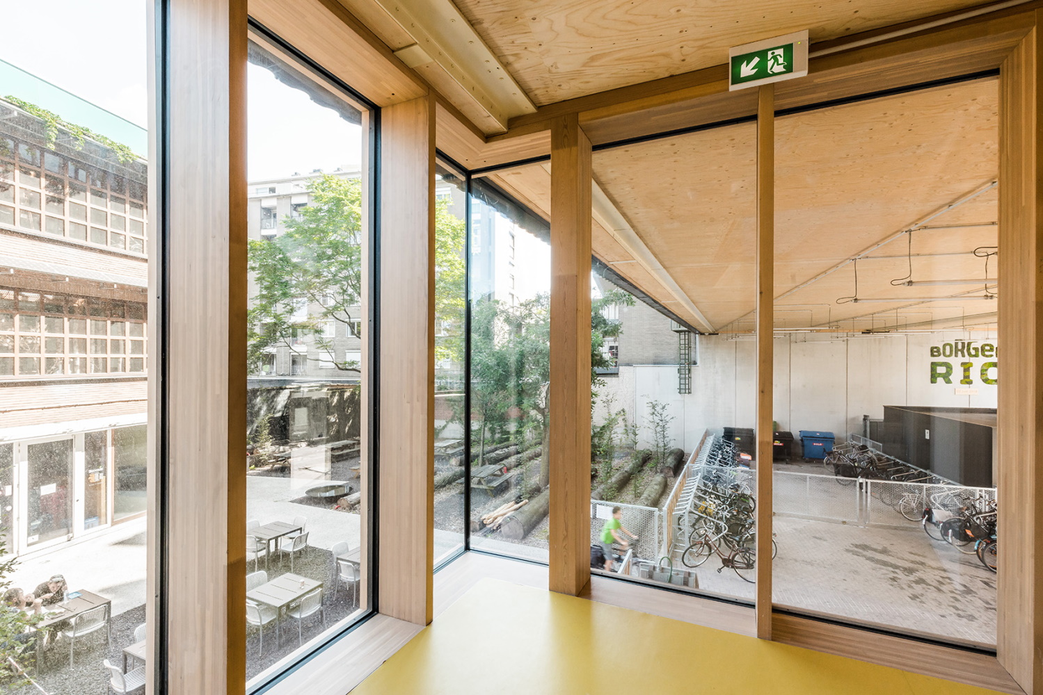 L'ensemble du bâtiment utilise des connexions sèches tels que des boulons et des plaques d'acier encastrées. Il peut donc être démonté et les matériaux, dont beaucoup ont déjà été récupérés dans d'anciens bâtiments, peuvent être réutilisés. Par exemple, les architectes ont utilisé des équipements sanitaires et des parois en verre provenant d'immeubles de bureaux démantelés. Le client avait déjà acheté deux lots de parois de bureaux usagés avant l'appel d'offres. Les architectes les ont intégrés dans les plans.
