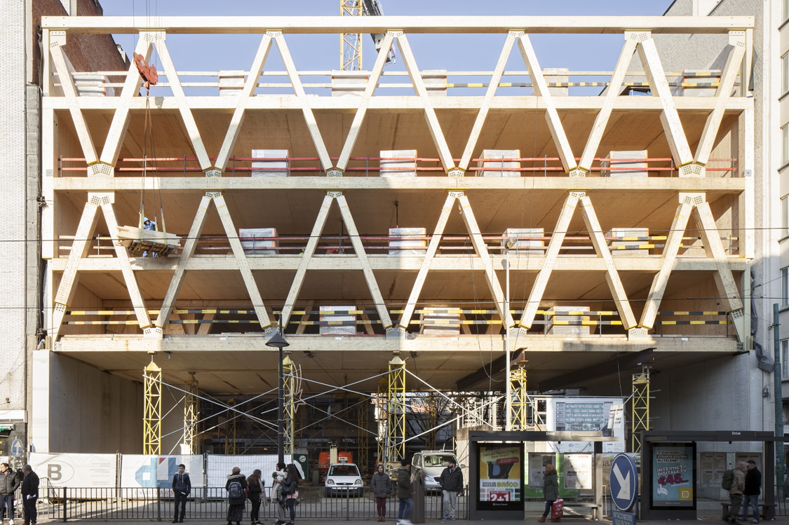Avec un seul noyau vertical et une structure principale composée de trois fermes en bois de quatre étages, B-architecten a créé un immeuble-pont compact. Avec cette construction, le cabinet d'architectes propose des solutions à un certain nombre de conditions préalables complexes. Par exemple, six mètres devaient rester libres au-dessus de la sortie de secours du métro, qui se trouve sur la parcelle, tandis que l'infrastructure souterraine du métro offrait des possibilités de fondation limitées. En outre, l'Ecohuis située sur la parcelle à l'arrière du site devait rester accessible et visible.