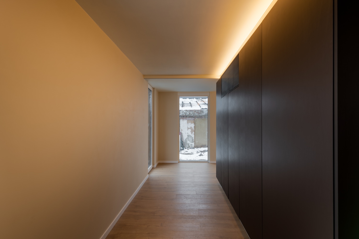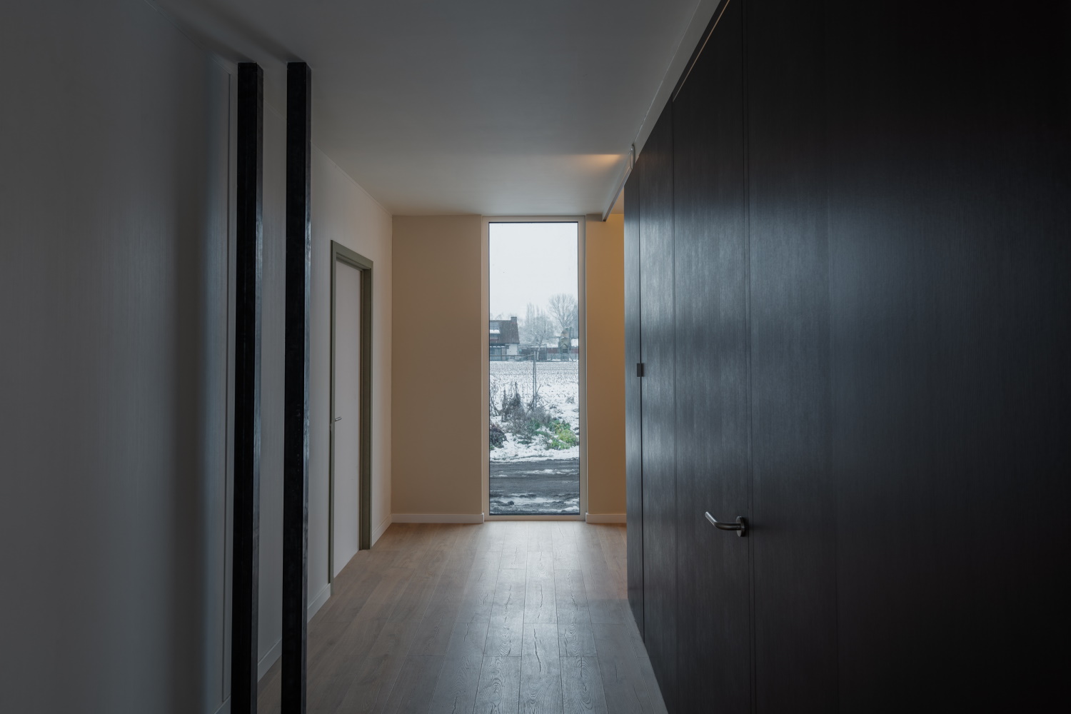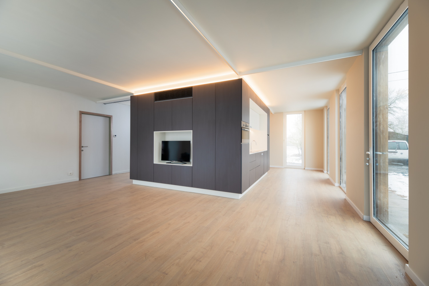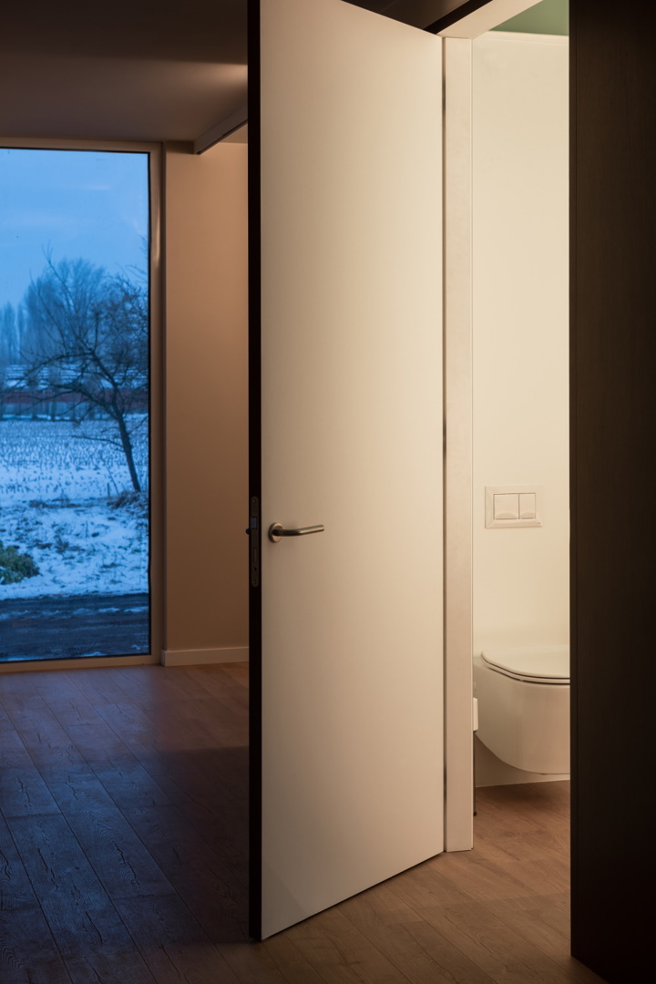 Toutes les techniques sont réunies dans ce volume central. Par conséquent, le bureau d'architectes n'a dû pratiquer qu'une seule ouverture dans le plancher pour permettre l’entrée de toutes les techniques. Les conduits de ventilation et d’évacuation passent également dans l'unité SAM de Bao Living à travers le plafond et le sol jusqu'à cette ouverture. L'éclairage, les câbles électriques et de données sont incorporés dans une structure de rails design au plafond. De cette façon, les architectes ont également pu atteindre les zones où il n'y a pas de murs intérieurs. Dans les pièces où ceux-ci sont présents, les tuyaux de chauffage, les prises de courant et les points de données sont incorporés dans les murs intérieurs afin de ne pas perforer l’enveloppe étanche de la maison.