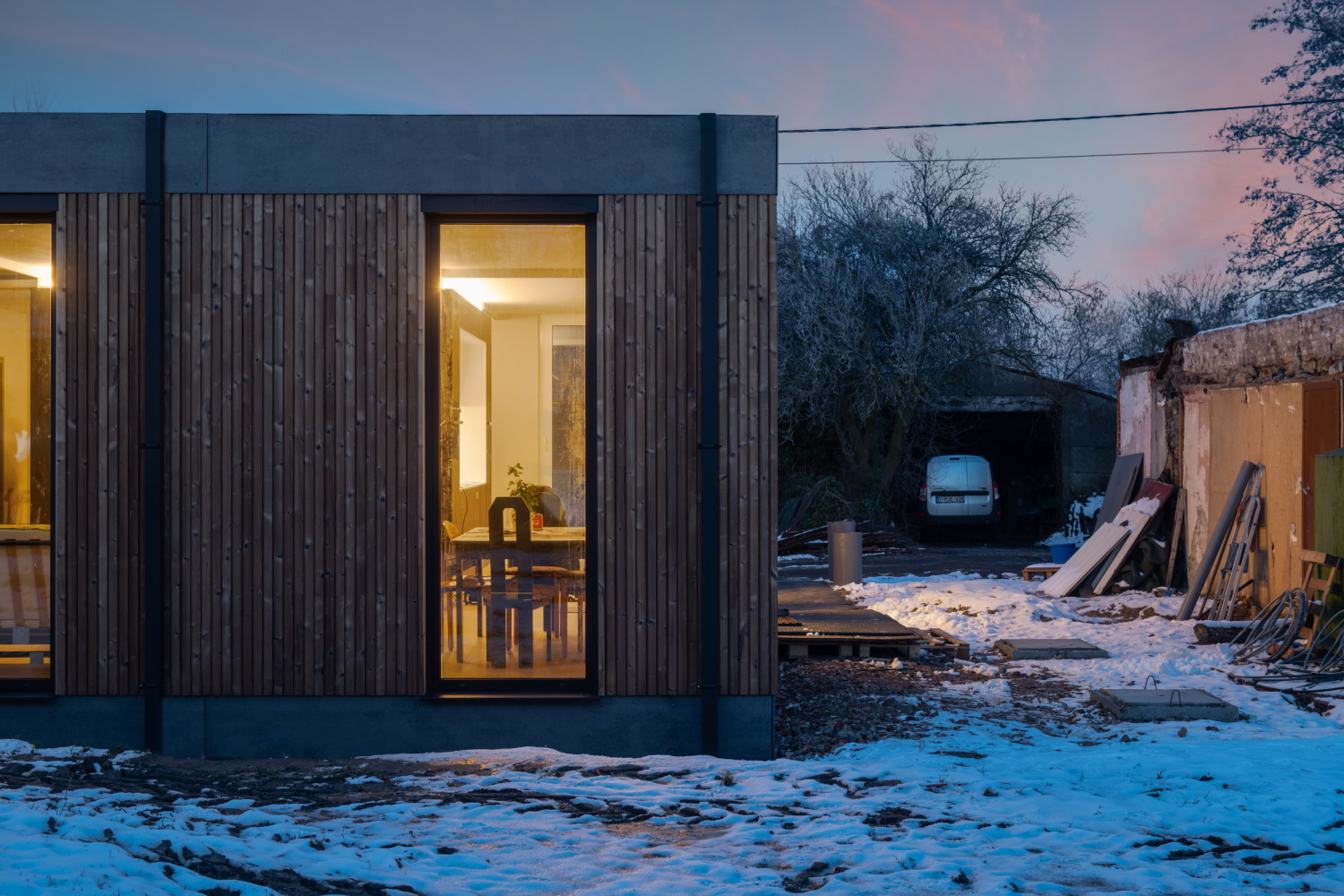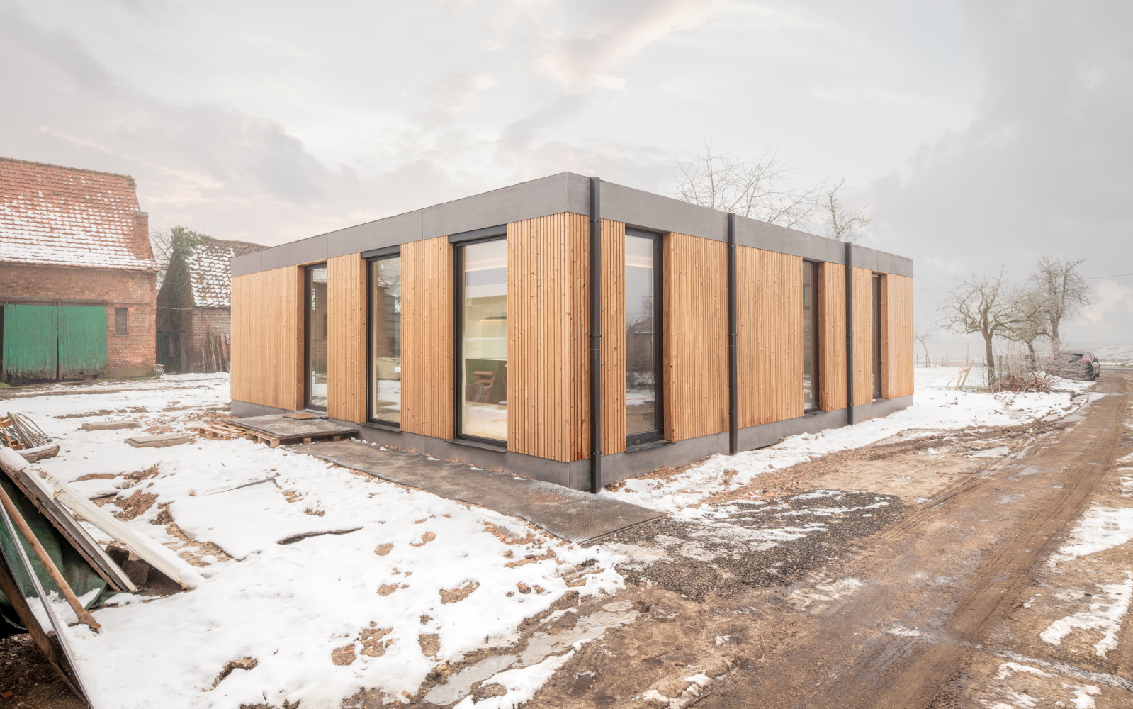 Ces trois modules préfabriqués ont été assemblés directement sur site pour former une maison étanche au vent et à l'eau. Cela n'a pris qu'un jour, ce qui se reflète également dans la courte période de réalisation de quatre semaines. Pour les architectes, ce projet a été une raison immédiate de contribuer à développer le Mobble de l'Université de Gand à l'échelle commerciale.