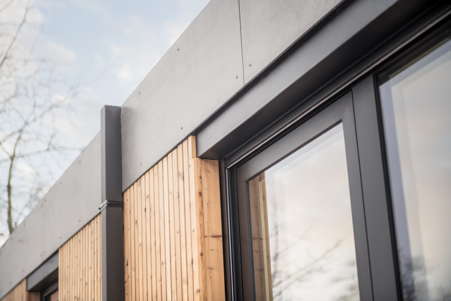 Les façades sont habillées d'un bardage vertical en bois et de bandes horizontales en fibres-ciment. Les fenêtres en aluminium qui se déploient du sol au plafond sont standardisées et toutes identiques. Selon BAST architects & engineers, elles sont la traduction architecturale de la logique inhérente aux unités de logement modulaires préfabriquées. En outre, les architectes ont laissé les évacuations d'eau de pluie visibles et ont utilisé de la laine minérale, du bois et de l'EPDM. Un système ClicWall et les profilés muraux intérieurs JUUNOO contribuent également à la circularité du logement. Quant aux techniques, BAST architects & engineers a opté pour des panneaux photovoltaïques, une citerne d’eau de pluie et une unité compacte de ventilation double flux.