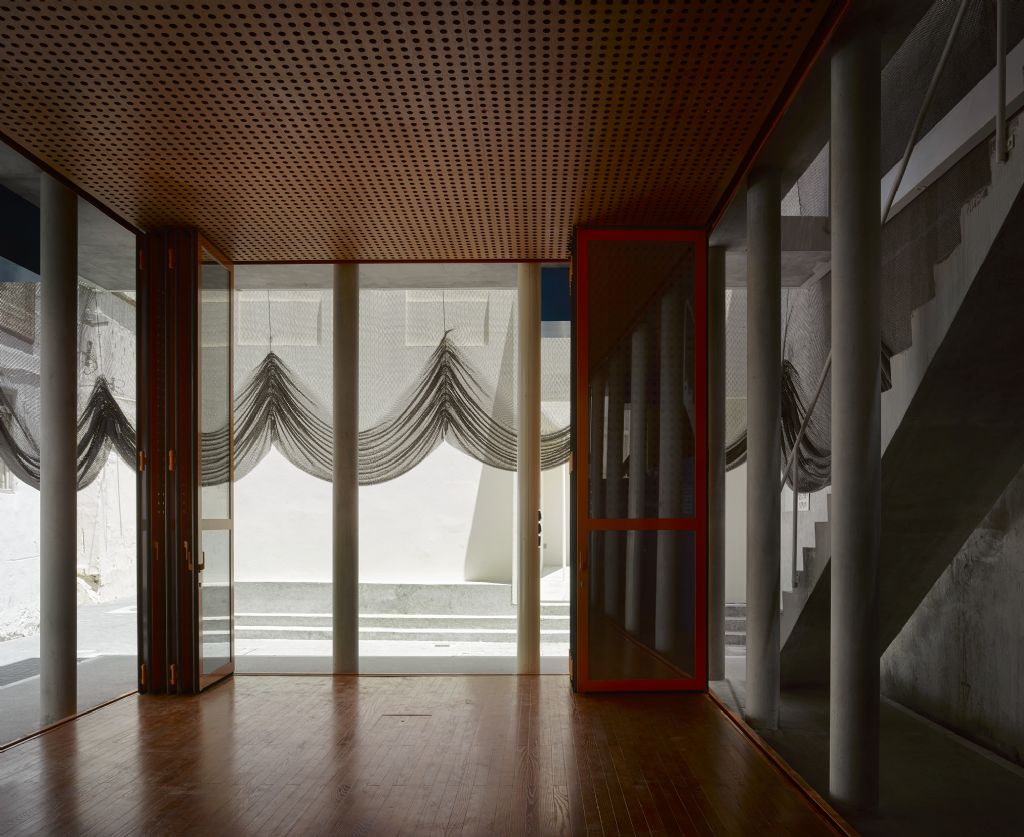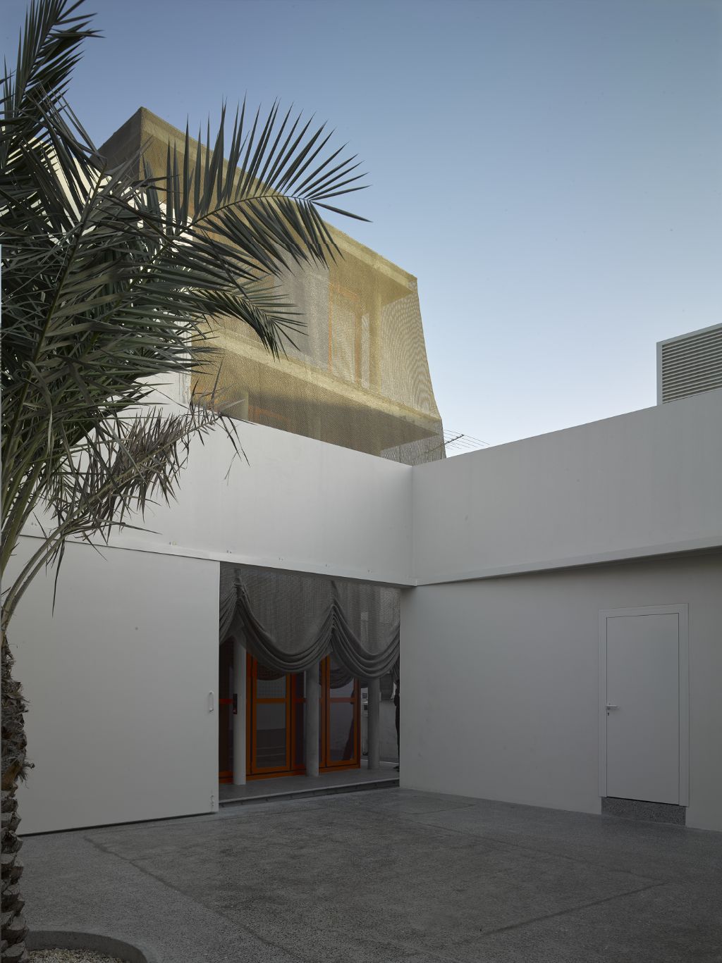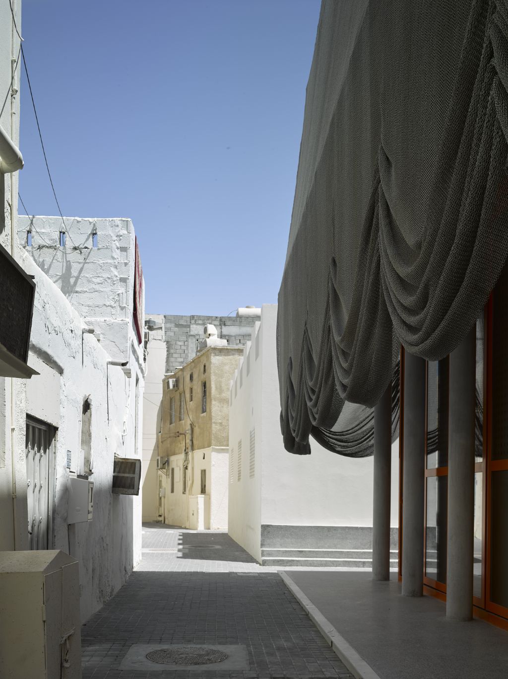 Le bâtiment Dar Al Jinaa fait partie d’un projet de rénovation urbaine à Bahreïn. Il ancre les traditions musicales et culturelles des pêcheurs de perles locaux dans le dense tissu urbain de Muharraq. Le projet est le résultat d’un dialogue fructueux entre méthodes de construction occidentales et locales. Dar Al Jinaa se compose d’une structure simple faite de colonnes rondes et de plateformes en béton. Des portes articulées en verre, équipées de volets perforés en bois, définissent des périmètres comme autant d’espaces intérieurs intimes. Les escaliers, locaux sanitaires et installations techniques sont conçus comme des pièces de mobilier. Le volume est recouvert d’un voile d’acier sans joint, qui sert, avec les plateaux en porte-à-faux, de protection solaire tout en transformant les bâtiments en objets voilés. Quand le bâtiment est utilisé, le voile est relevé pour donner aux passants une vue sur les représentations qui s'y déroulent.