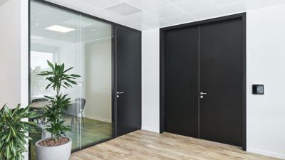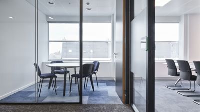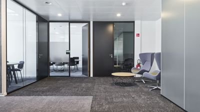 Les produits Beddeleem utilisés sont des cloisons amovibles JB PURE 100, des ensembles de portes JB DOOR, des cache-convecteurs JB CONVEC, un comptoir d'accueil JB CUSTOM et des meubles sanitaires.