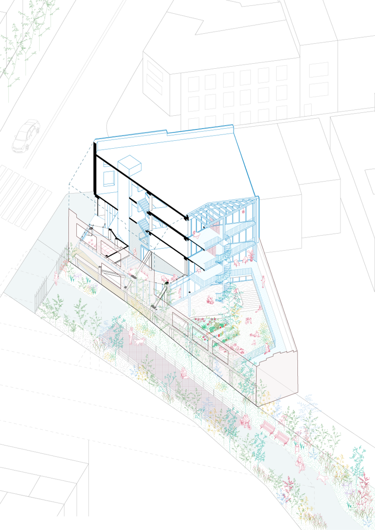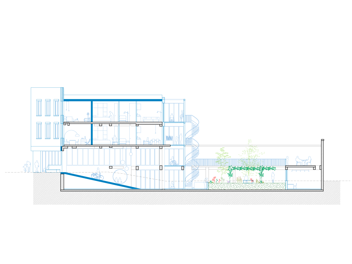 La récente requalification menée dans le cadre du Contrat de Quartier Heliport-Anvers a notamment permis la création du parc de la Senne : un long ruban vert qui restructure le quartier et y réintroduit des espaces publics longtemps absents. Le projet conçu par BETA et Kaderstudio s’inscrit directement dans cette dynamique. Il agit comme un lien entre sphère privée et espace public. Sa position stratégique transforme le bâtiment en une porte d’entrée accueillante et en un catalyseur de nouvelles dynamiques sociales pour le quartier.