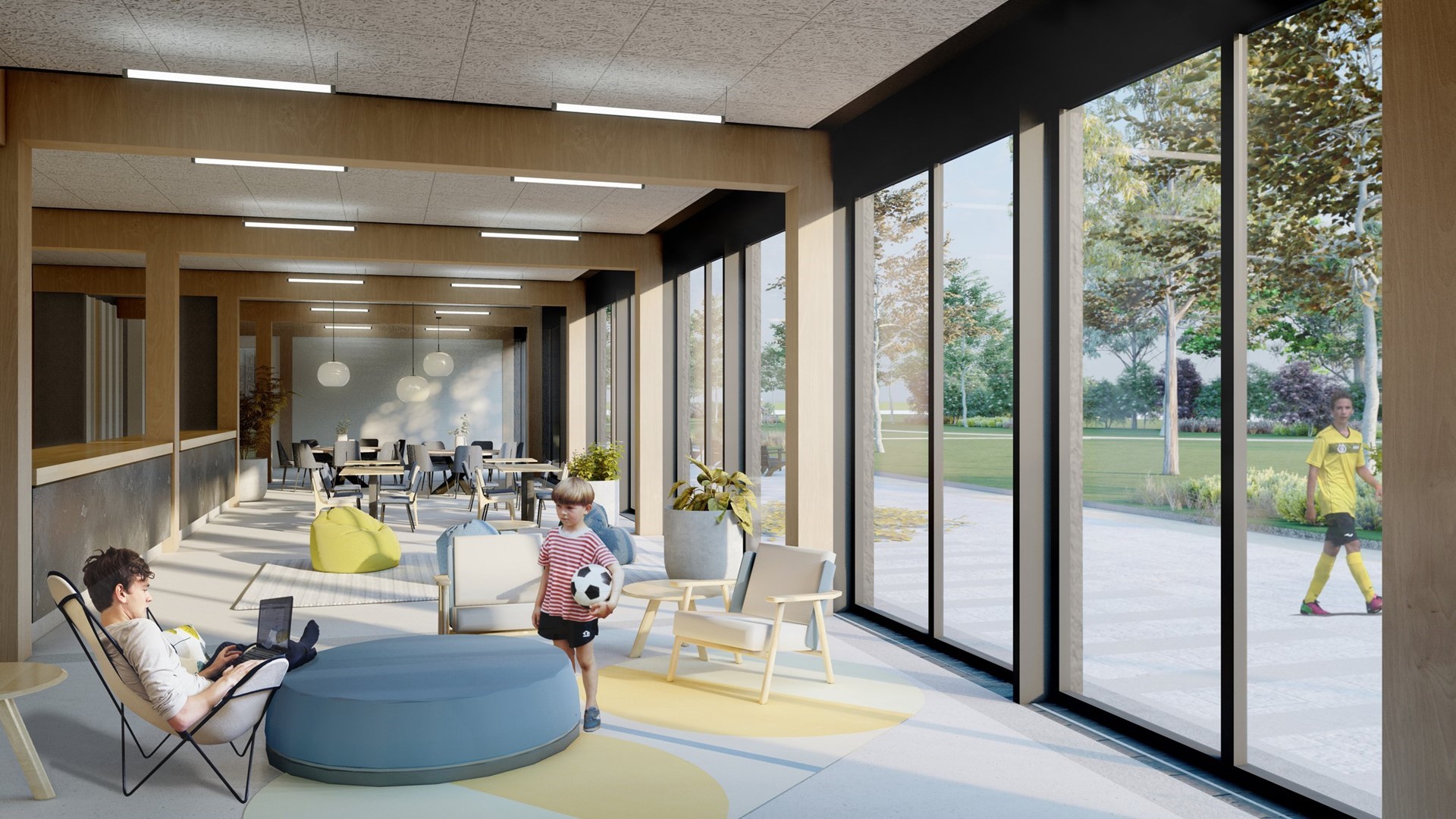 Les locaux (intérieurs) du SK Deurne, qui comprennent une cafétéria, des vestiaires, des installations sanitaires, une salle de premiers secours et un espace de stockage, auront leur place dans le nouveau centre, qui comprendra également un café avec cuisine et une grande salle polyvalente avec cuisine et bar également. Cette dernière peut être divisée en unités plus petites qui pourront faire office de salles de réunion. Le programme spécifique du nouveau centre est basé sur les souhaits et les exigences de plusieurs habitants et associations de Diest, qui ont été interrogés à plusieurs reprises au cours des réunions préalables à l'élaboration du projet.