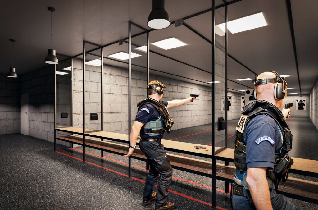 Le projet comporte un stand de tir, une armurerie ainsi qu’un complexe cellulaire. Les techniques et les matériaux ont donc été adaptés à des impératifs très stricts de sécurité et de fonctionnement. Il en va de même pour les façades du bâtiment (vitrage blindé, sas sécurisé, etc.).