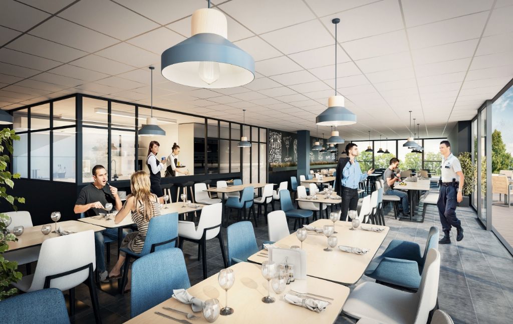 Le cœur du bâtiment s’ouvre sur 2 niveaux. C’est un espace ouvert ou les flux des services se croisent, à proximité directe de l’espace cafétéria, lui-même donnant sur une terrasse idéalement orientée et positionnée loin des zones visibles ou accessibles du public. Un escalier principal, distinct des circulations verticales de service ou de secours, accueille les utilisateurs comme une main tendue. Il gravit l’étage pour donner accès à la passerelle, à la croisée des services et de la zone réservée à la direction. Ce dernier espace, en débord et surplombant l’entrée du personnel, marque volontairement sa présence dans la volumétrie globale et offre un contrôle visuel permanent sur l’entrée des véhicules de service et du personnel.