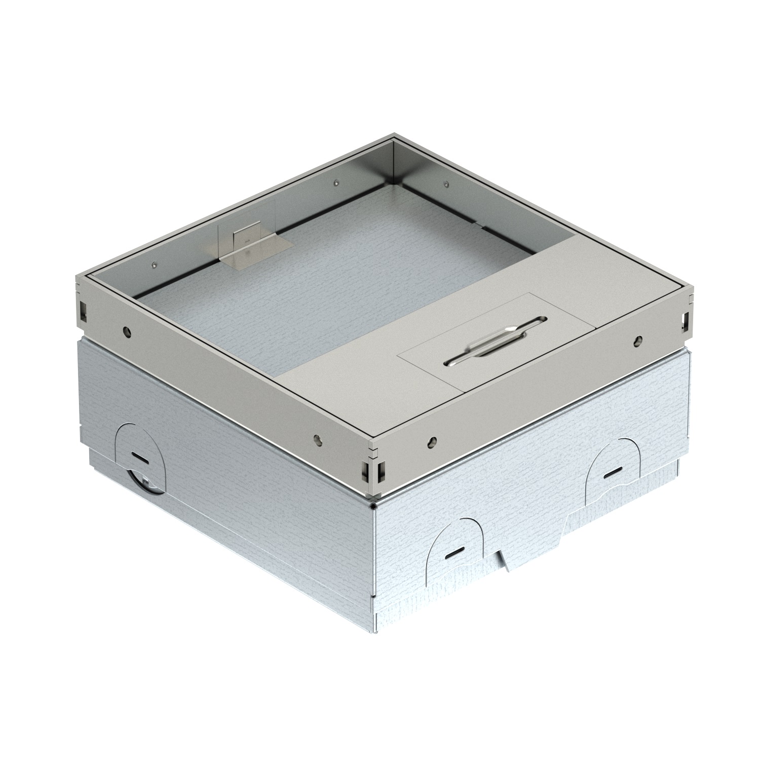 Le boitier de sol UDHOME-ONE est très compact et son intégration dans le sol nécessite très peu d’espace. Il peut être monté directement sur le sol non fini, raccordé par des câbles d’installation flexibles et ensuite achevé en même temps que la chape. Ses petites dimensions extérieures de 140 x 140 mm et sa petite hauteur d’encastrement à partir de 75 mm font qu’il est extrêmement plat et adapté aux chapes fines. Grâce à son mécanisme de nivèlement intégré, UDHOME-ONE peut aussi être installé dans des sols qui font jusqu’à 100 mm.