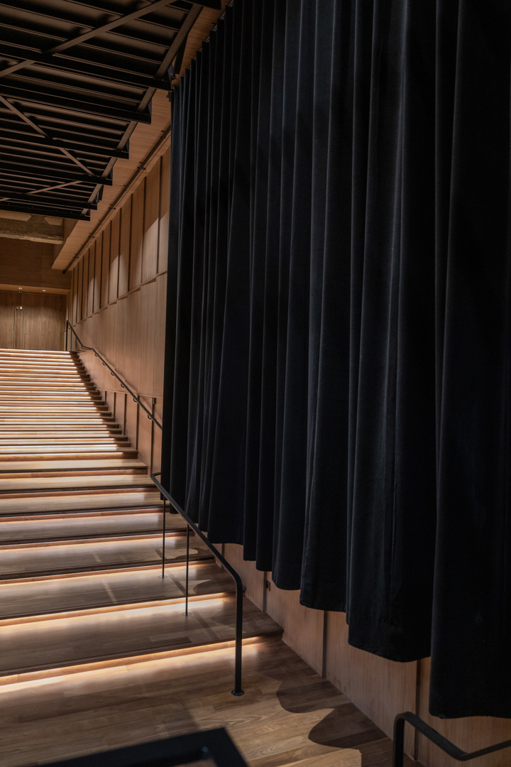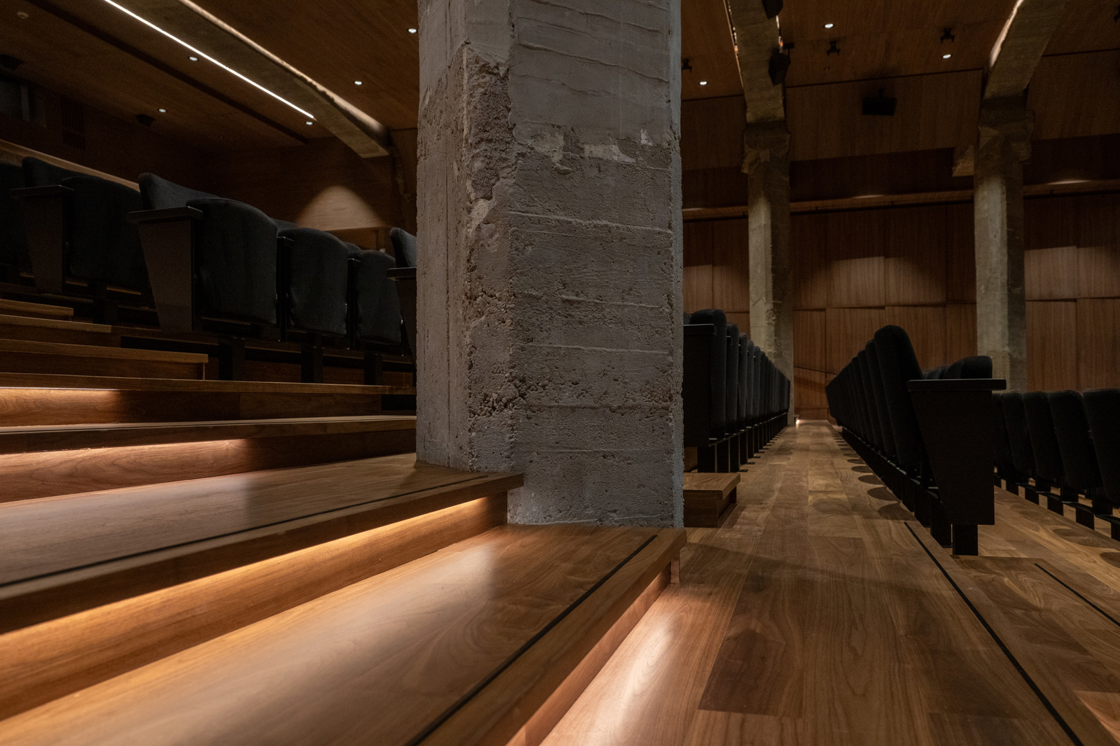 Les ajouts ultérieurs ont été supprimés, ce qui a permis de récupérer environ 30 % de volume supplémentaire et d’améliorer les conditions acoustiques. Une nouvelle enveloppe, ajustée aux murs et plafonds structurels, laisse apparaître colonnes et poutres d’origine. La nouvelle tribune en bois, repose sur des matériaux résilients afin d’améliorer le confort acoustique. Des colonnes carrées orientées à 45 degrés favorisent la diffusion sonore. Un revêtement en noyer canadien, posé horizontalement avec un léger chevauchement, renforce la qualité acoustique et dialogue avec le béton existant. La salle compte désormais 471 places assises ainsi que cinq emplacements destinés aux personnes à mobilité réduite.