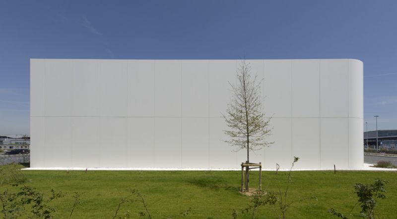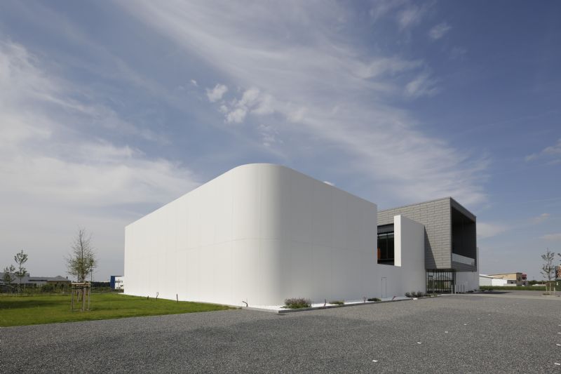 A la surenchère de langages architecturaux présents sur le site de l’Aéropôle de Gosselies, Art & Build Architect a préféré un langage extrêmement épuré, sobre, qui témoigne d’une grande sérénité. Le socle blanc se fait à la fois protecteur de l’activité à l’intérieur du bâtiment – protection contre les apports solaires, contre les nuisances sonores, contre l’intrusion –, mais aussi écran blanc, support potentiel de toutes les communications, qui sont au coeur même du métier de BRUTÉLÉ. L’élément qui surplombe le socle cristallise l’identité de l’entreprise au travers d’un parallélépipède de métal et de verre, évoquant l’industrie aéronautique. Il est aussi l’expression des fonctions collectives de l’entreprise telle que la salle du conseil, le restaurant d’entreprise, mais aussi la direction.