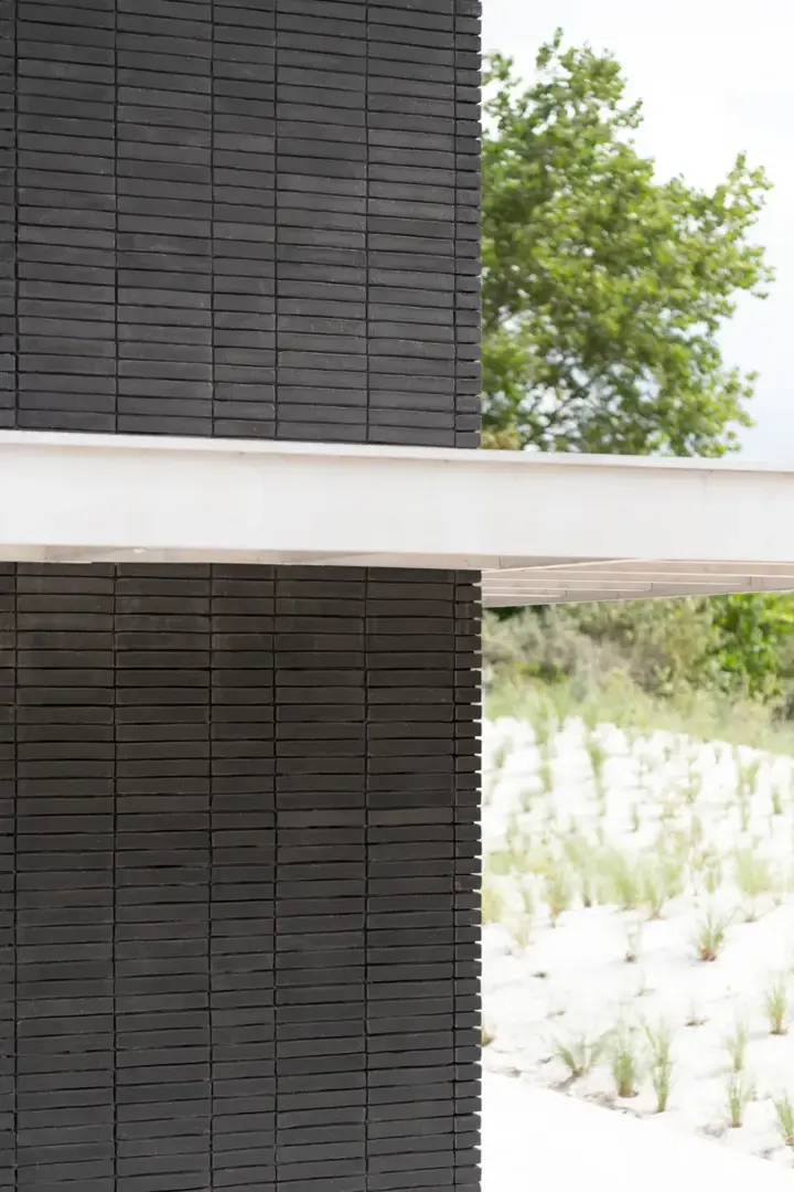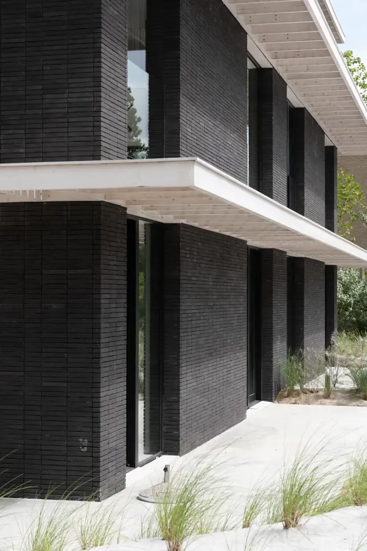 Le choix de la brique de façade Vande Moortel linea7 7021 est à cet égard déterminant. La brique sombre crée un contraste puissant avec les structures d’auvent en bois blanchi à la chaux, conférant au projet une apparence résolument contemporaine et affirmée. Vue de loin, la façade se présente comme un ensemble homogène et monolithique, tandis que, de près, la brique révèle une texture subtile et un jeu de lignes délicat. La finition sablée de cette brique moulée à la main génère cette texture discrète. La géométrie épurée de la brique de façade, propre à la gamme Kaliber, contribue quant à elle à la finesse du tracé linéaire.