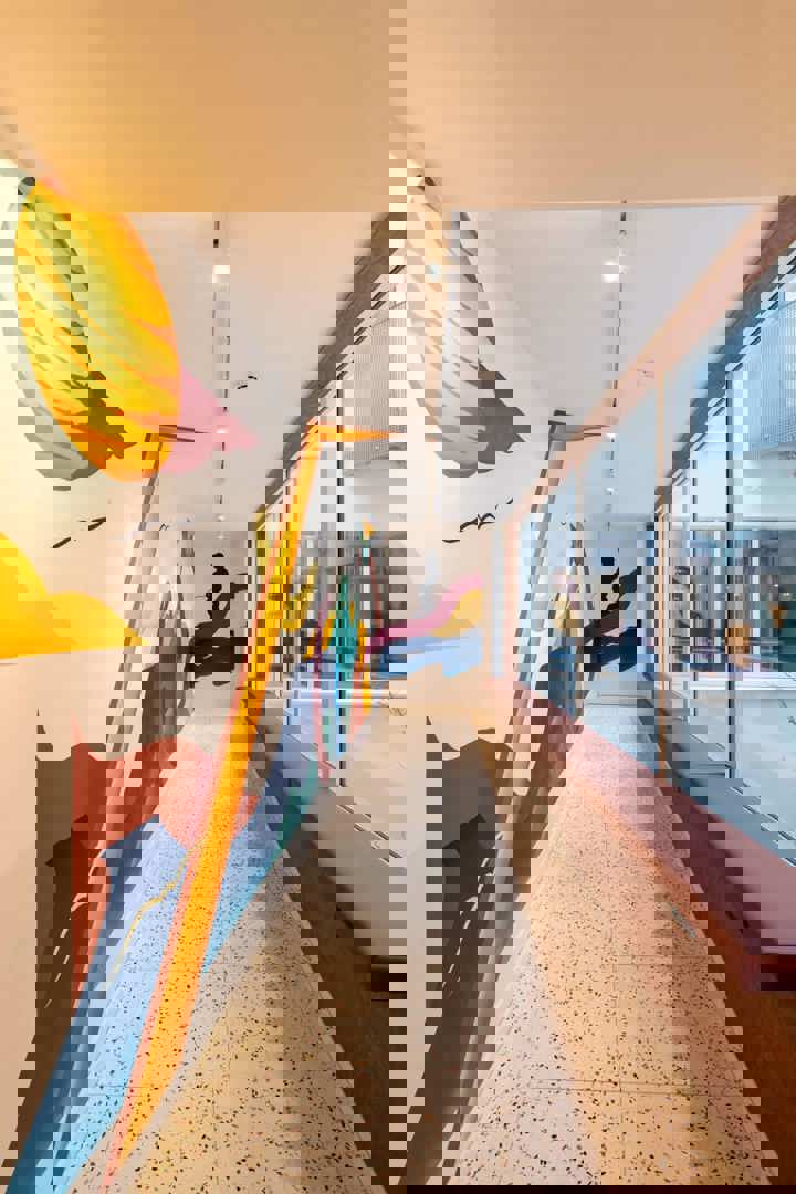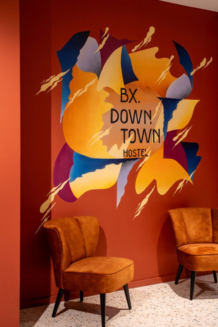 L’intérieur de BX. Downtown Hostel respire le caractère. Des teintes chaleureuses sont combinées à des accents colorés audacieux, créant une ambiance à la fois ludique et maîtrisée. Le bar et le comptoir d’accueil constituent de véritables points d’attraction et donnent immédiatement le ton à l’arrivée.