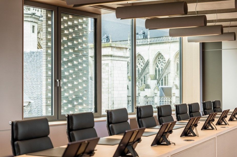 L’agence d’architecture Robbrecht & Daem a conçu une série d’éléments d’éclairage décoratifs qui servent les deux objectifs. Elle a fait appel au matériau CALME de Sonogamma, un absorbant microporeux unique constitué de fins granulés aluminium d’une haute pureté agglomérés qui offre une absorption acoustique large-bande sans matériau de remplissage : Une lame d’air lui suffit. Calme est en outre incombustible, non corrosif et 100% recyclable, ce qui correspond parfaitement à la philosophie durable du groupe. Les panneaux CALME cintrés au look gris argenté font office d’ abat-jours acoustiques pour les luminaires LED qui se fondent subtilement dans les plafonds des bureaux paysagers, des salles de réunion et de l’accueil. Suivant la configuration de la salle, leur suspension est pentagonale ou alignée. Ainsi, les armatures d’éclairage allient confort acoustique et fonctionnalité et s’accordent parfaitement avec l’architecture épurée du bâtiment. Les luminaires acoustiques CALME contribuent au bien-être des salariés sur le plan visuel et sonore et permettent ainsi des gains de productivité pour l’entreprise. La combinaison unique d’un plafond rayonnant hydraulique basse température et d’un matériau aux performances acoustiques pérennes, recyclable et sans fibre fait de ces armatures d’éclairage au design unique un atout indispensable sur tout lieu de travail.