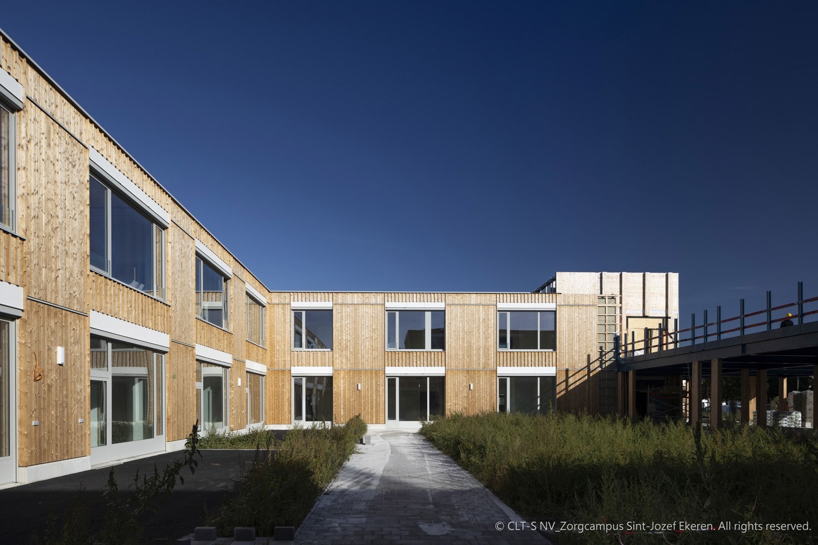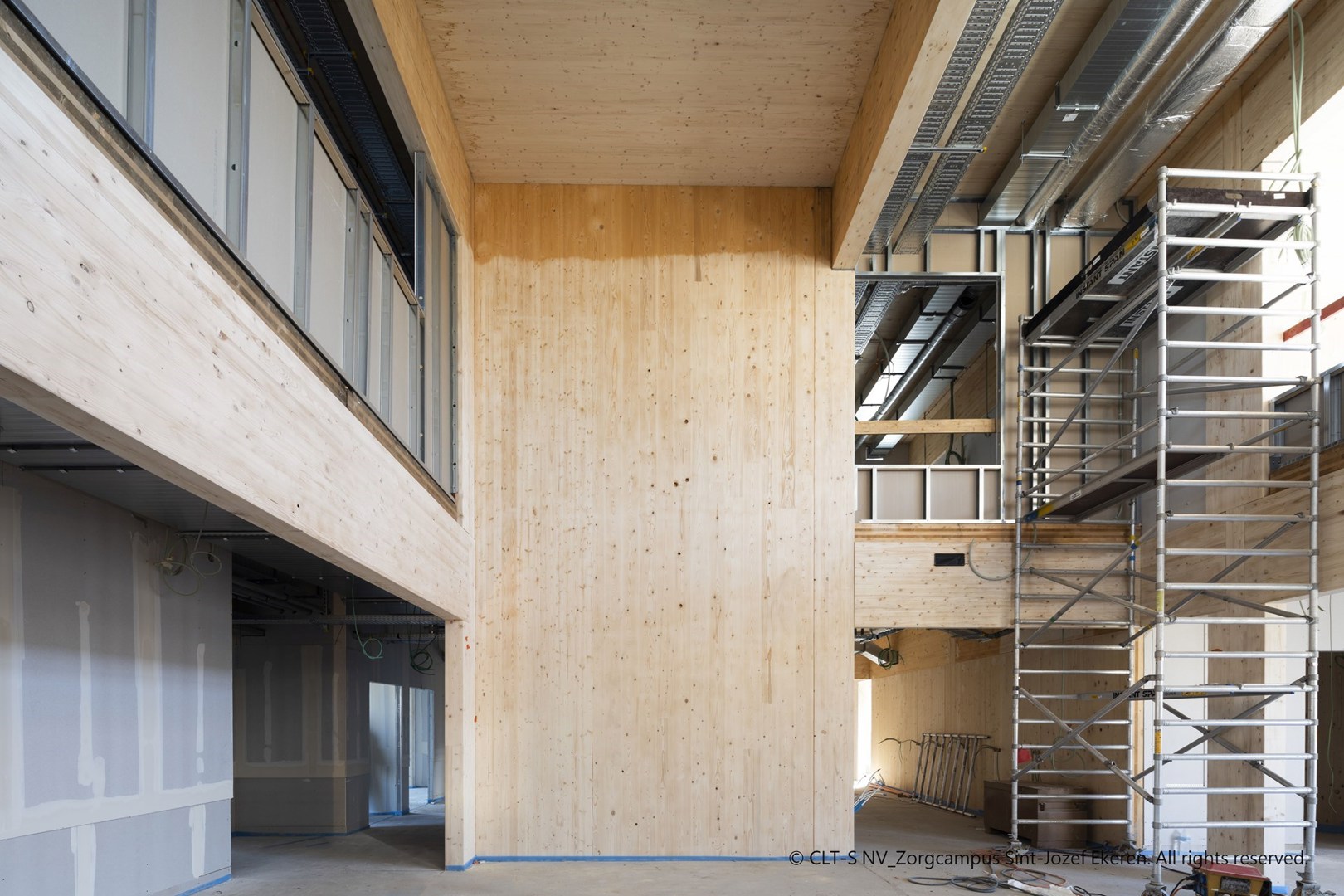 Le maître d’ouvrage et le bureau d’architecture ont délibérément choisi le CLT comme matériau de construction. Outre le fait que le bois est durable et que l’utilisation du CLT permet de construire un bâtiment en un temps record, le bois est aussi un matériau apaisant. Il fournit la structure nécessaire et a un effet bénéfique sur le comportement des enfants. « Pour le maître d’ouvrage, sur un campus qui accueille principalement des enfants ayant besoin de soins, il était essentiel de travailler avec du bois. Le caractère chaleureux du bois présente d’énormes avantages. Pour cette raison, nous avons opté pour du bois apparent à l’intérieur comme à l’extérieur. Le CLT est donc un élément architectural à part entière », explique Jona Michiels, Innovation Manager du groupe Van Roey, l’entrepreneur principal du projet.