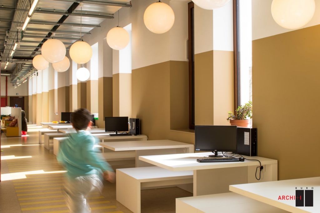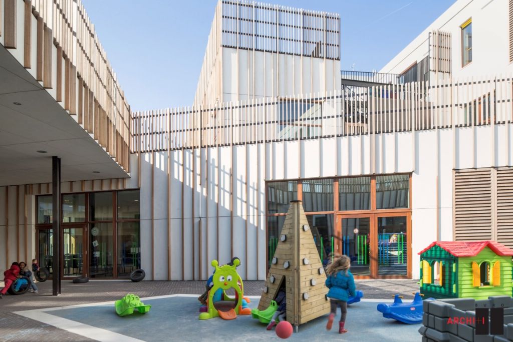 Les différentes sections sont bien déterminées dans le bâtiment, ainsi que la cascade d’espaces intérieurs qui en font partie. L’école maternelle est dirigée vers l’espace intérieur, qui offre plus de protection, tandis que les sections pour les plus grands regardent plus vers le parc et le côté rue. Au rez-de-chaussée, on trouve un espace de jeu clos pour les bambins. Les autres élèves n’y entrent en principe pas. En empruntant un grand escalier, vous vous retrouvez dans un autre espace de jeu commun, situé au niveau du réfectoire et de l’entrée de l’école primaire. Au fur et à mesure que l’enfant grandit et gravit les étapes, l’approche est de plus en plus ouverte. Dès que commence l’école secondaire, l’enfant va pouvoir profiter d’une vue panoramique sur la ville et ses environs. En raison de la surface limitée du terrain par rapport à la population scolaire (680 élèves), la plus grande partie des toits est utilisée comme cour de récréation.