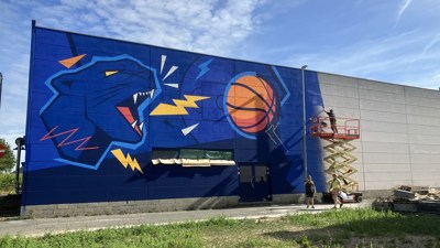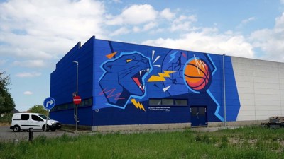 Les amateurs de basket-ball et d'art de la région de Dendermonde peuvent admirer une nouvelle œuvre d'art sur la façade de la Pantershal du club de basket-ball « De Panters » de Baasrode depuis début août. Cette murale de 15 mètres de haut et de 8 mètres de large est le fruit d'une collaboration entre l'artiste Moodpie, Schilderwerken De Rijcke, Avor-Colordecor et Caparol.