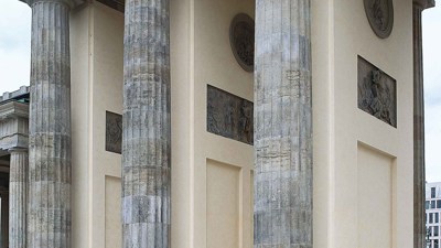 En plus de 200 ans, la porte de Brandebourg a non seulement connu une histoire mouvementée, mais a également subi de nombreuses interventions. En 1788, Frédéric II chargea l'architecte Carl Gotthard Langhans de la construction de la porte, qui dura trois ans. En 1794, sous la direction de Johann Gottfried Schadow, elle reçut sa décoration figurative. Les reliefs dans les passages de la porte, la frise de métopes, les statues de Mars et de Minerve ainsi que le quadrige gravé sur cuivre lui donnèrent son aspect unique. Pour des raisons de coûts, on a renoncé à utiliser du marbre de Carrare et on a préféré le grès des réservoirs situés dans la région. Une peinture claire donnait l'illusion d'un marbre blanc. Mais le plaisir n'a pas duré longtemps. Devenu inesthétique, il a été repeint en 1804 dans une teinte ocre que les Berlinois appelaient "café au lait". Depuis 1926/27, la porte se présente dans sa nature de grès. Elle a surtout été endommagée durant les derniers jours de la Seconde Guerre mondiale, lors de la bataille de Berlin. Les rénovations entreprises par la suite se sont limitées à des mesures d'entretien et d'embellissement sporadiques ou à des délais serrés, en raison du manque d'argent et de matériaux appropriés. Avec la construction du mur en 1961, la porte de Brandebourg est devenue le symbole de la division de l'Allemagne, et avec sa chute en 1989/90, l'emblème de l'unité nationale.