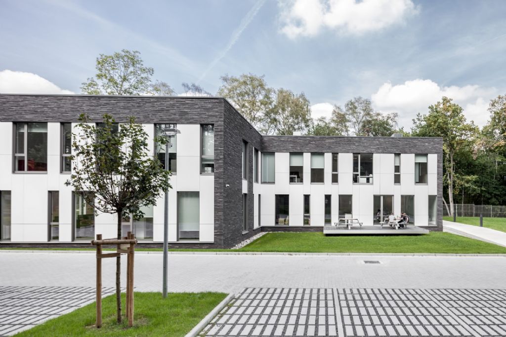 Le parement du volume principal est réalisé en briques collées. Leur texture, leur long format et l’absence de joints génère un effet de strates horizontales qui donne à l’ensemble un aspect minéral en adéquation avec le milieu naturel boisé dans lequel le bâtiment s’inscrit.