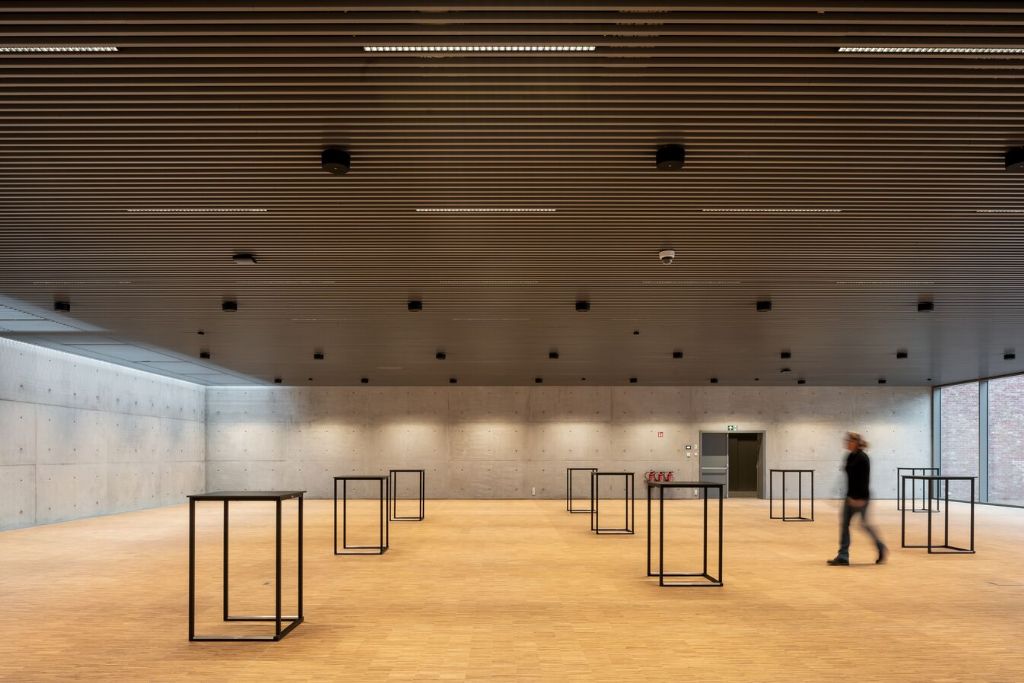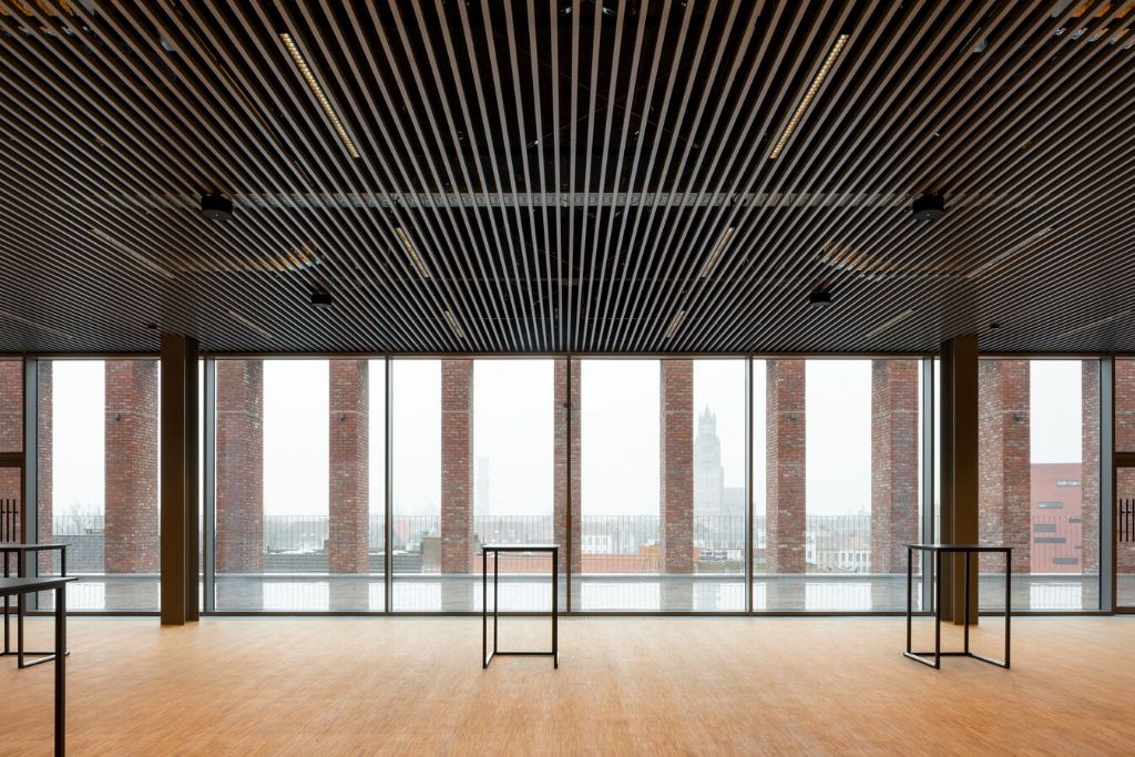 En plus du hall d’exposition, il y a des salles de réunion avec huit salles de réunion, un espace de restauration de 650 mètres carrés et une terrasse adjacente avec vue sur les tours de Bruges. L’auditorium divisible avec tribune rétractable et espace pour 500 visiteurs a également l’air moderne. Il y a aussi un espace souterrain pour 124 voitures et 200 vélos.