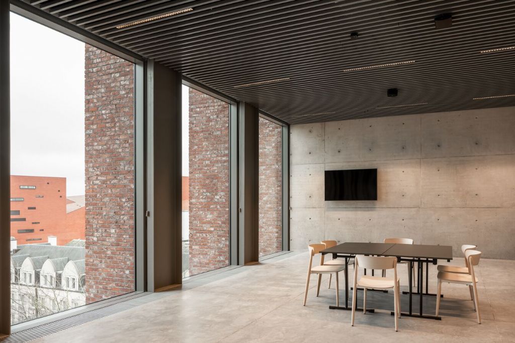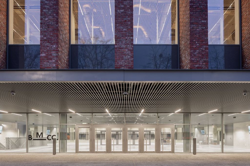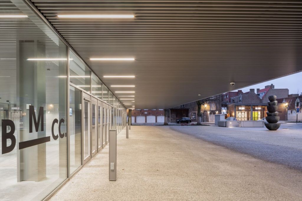À première vue, le BMCC semble imposant et moderne, presque futuriste, en raison de ses formes rectangulaires. Cependant, si vous zoomez, vous verrez certainement des similitudes avec le centre-ville historique autour du bâtiment. Les colonnes massives en briques rouges et robustes confèrent au bâtiment un aspect robuste et massif, adapté à la palette de couleurs de la ville: un clin d’œil à la ville historique de Bruges.