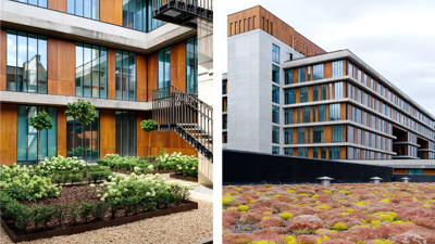 Le site du Sart Tilman est situé dans un paysage particulier. Dans le respect de ce paysage naturel, nous avons travaillé à une implantation soignée du bâtiment. Les espaces verts et les plantations du bâtiment sont en harmonie avec les collines verdoyantes des environs. De plus, les plantations se reflètent sur les toits verts visibles depuis les différents coins du bâtiment.