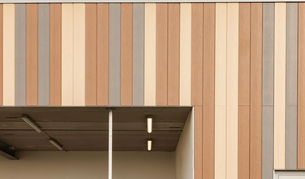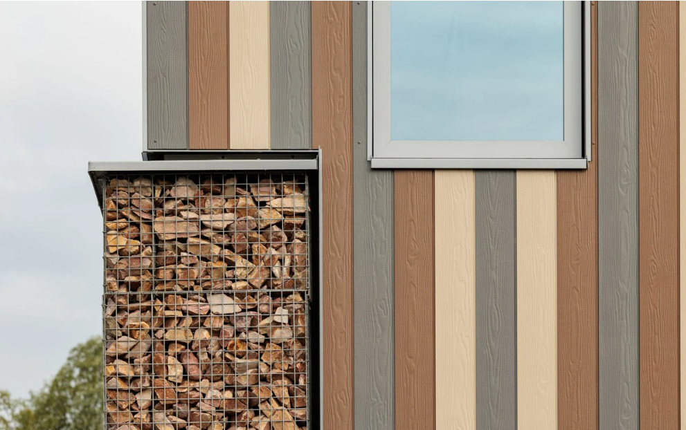 La large palette de couleurs proposée par CedralClick Wood a été déterminante dans le choix final. Les architectes ont opté pour une pose verticale des lames, combinant trois teintes distinctes (C03, C54 et C78). « Nous voulions créer un bâtiment avec une façade à l’esthétique naturelle. Une finition monochrome n’aurait pas correspondu à notre vision », poursuit Jeroen Kaan. « Nous avons testé plusieurs combinaisons, y compris différents tons de gris, mais c’est finalement le mélange de brun argile, gris étain et brun cacao qui s’est imposé, en parfaite harmonie avec l’aspect bois recherché. Nous avons appliqué ces trois couleurs dans différents motifs, qui s’alternent sans rupture. Cela donne une impression aléatoire, mais reposait sur une logique claire pour l’entreprise Saambouw chargée de la pose. »