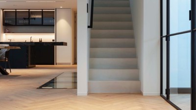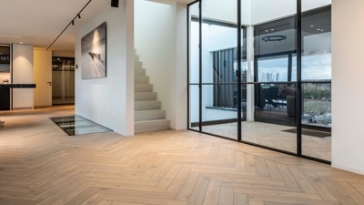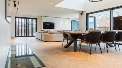 Chez eux, Barbara et Kevin ont réussi à harmoniser plusieurs styles. Chaque espace possède son identité propre, avec un sol adapté à sa fonction. « Nous avons choisi trois styles différents : longues lames, chevrons et carrelage – tous de chez Coretec. Dans le salon, nous avons posé un motif en chevrons et intégré une trappe vitrée donnant sur la cave à vin au sous-sol. Elle méritait bien son propre espace. »