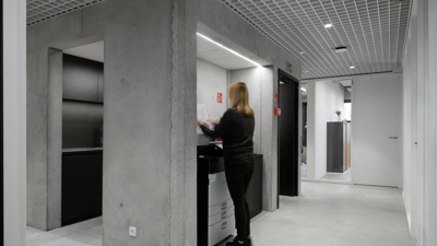 La situation du site, en zone industrielle, a aussi poussé l’équipe vers le béton comme matériau principal. Le bâtiment final est en forme de gradins, en hauteur comme en profondeur, et symbolise parfaitement le fonctionnement interne de la police.