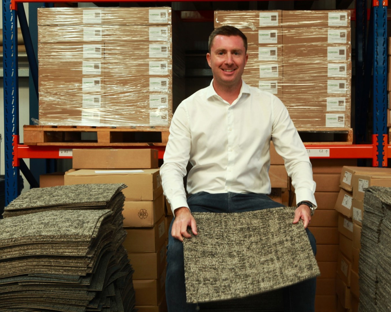 « Le process est somme toute assez simple : Nous sommes contactés par un client, possédant un gisement de matériaux, soit des dalles de moquette usagées dont il veut se débarrasser pour une raison ou une autre. Après s’en suit un audit sur site, où nous déterminons quelles dalles peuvent être reconditionnées. Celles-ci sont ensuite nettoyées en profondeur, par Composil et avec des produits ne contenant plus aucune substance chimique, excusez du peu. Les équipes des ateliers protégés prennent ensuite le relais, et s’occupent de la manutention et du triage, pour récupérer les dalles de moquette à reconditionner. Une fois qu’elles sont remises à neuf, elles sont ajoutées dans les stocks de réemploi de Composil. Les dalles trop endommagées sont quant à elles envoyées chez Tarkett, qui les réintègre comme matière première dans son circuit de production, avec une quantité de matière première nouvelle extrêmement faible, de l’ordre de 1 ou 2 %. Enfin, les dalles « irrécupérables » sont transformées en pellets de chauffage. Absolument rien n’est perdu ».
