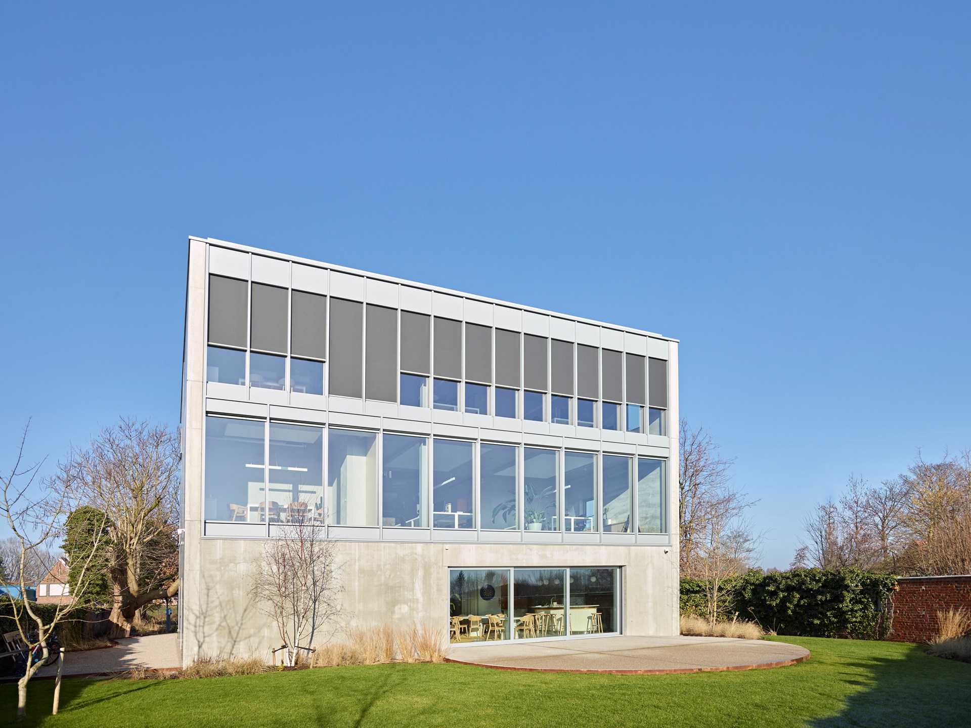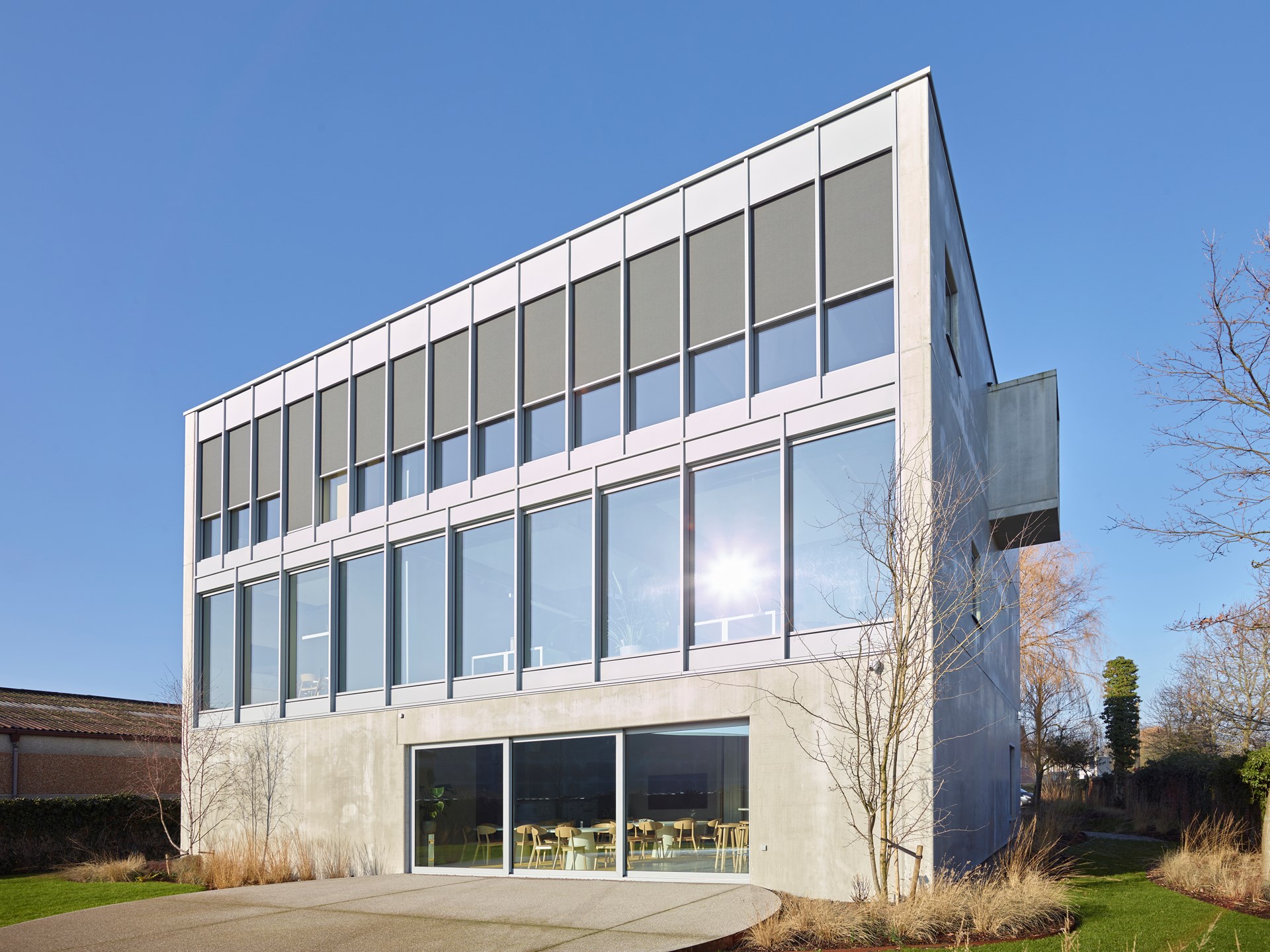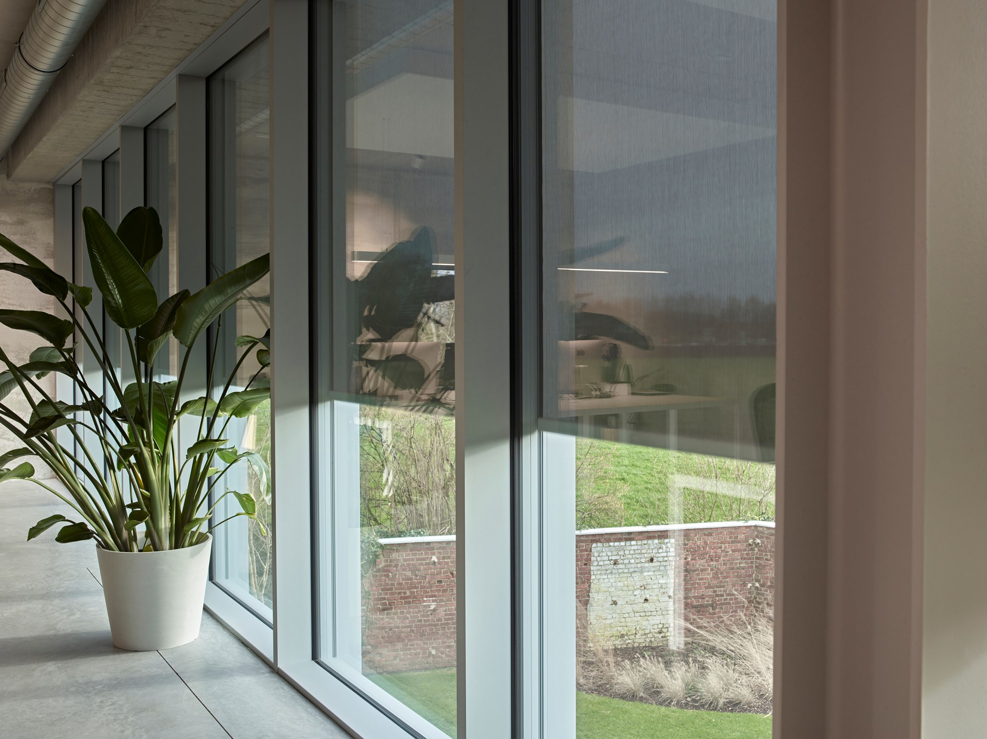 Lein Aluminium s’est avéré le partenaire idéal pour la réalisation de la façade vitrée. Cette entreprise de Zonnebeke était en outre déjà familiarisée avec les produits de Reynaers Aluminium et de Renson, qui venaient de présenter leur nouveau développement conjoint en matière de façades vitrées et de stores de protection solaire.