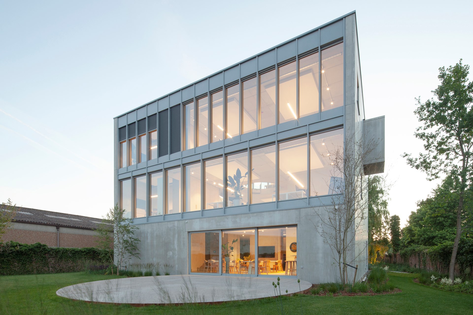 « Un concept n’est jamais le fruit d’un architecte seul », explique Sander Verhanneman (architecte - Rohm). « Pour ses nouveaux bureaux, Hannibal souhaitait avant tout préserver le caractère du jardin ; c’est pourquoi nous avons réduit autant que possible l’empreinte au sol du bâtiment. Cela impliquait une construction à trois étages, un projet pour lequel la ville de Roulers a heureusement marqué son accord. Le fait que l’on puisse admirer la ligne d’horizon de la ville depuis le second étage constitue en outre un point de repère agréable. D’un point de vue budgétaire, nous avons adopté une approche “industrielle” du projet, mais ce sont précisément les nuances grisées et les lignes épurées qui inspirent la tranquillité en contraste avec la verdure du jardin. » Celui-ci se prolonge pour ainsi dire à l’intérieur du bâtiment et fait partie intégrante de l’intérieur. Prenons par exemple les façades vitrées des premier et second étages - conçus comme un duplex paysager privilégiant la vue sur l’extérieur - qui offrent la cime majestueuse des arbres pour décor. Plus que jamais, l’intérieur et l’extérieur se confondent à merveille. « Avec une façade vitrée tant à l’avant qu’à l’arrière, on peut carrément voir à travers le bâtiment », précise Sander Verhanneman. « Cela confère une très grande ouverture au bâtiment, sans oublier que l’intérieur est baigné de lumière. »
