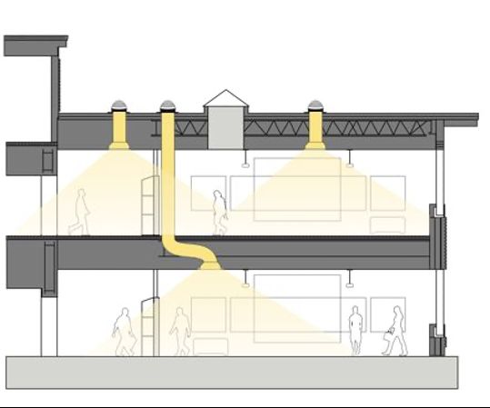 Le plus intéressant est que la conception du tube flexible du TDD permet une configuration simple pour de nouveaux emplacements de cloison si les besoins de l'utilisateur changent. Le dôme en polycarbonate situé sur le toit reste à son emplacement d'origine, mais la lentille de distribution de la lumière et les tubes peuvent facilement être réalignés pour s'adapter au nouveau design. Les diffuseurs peuvent être remplacés et de nouvelles lentilles à effet ou des régulateurs d'éclairage peuvent être ajoutés ou retirés pour personnaliser le nouvel espace. Cela équivaut à une adaptabilité simple et abordable pour les besoins actuels et futurs d'un bâtiment.