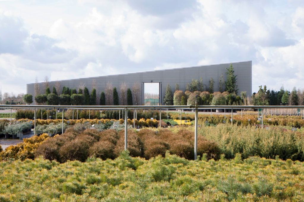 La fonction principale de ce bâtiment industriel est de garder les plantes au sec avant leur déplacement. Le séchage des plantes nécessite uniquement un flux d’air et une protection contre la pluie. Le bâtiment a donc été conçu comme un périmètre perforé avec un toit fermé. Les silhouettes des plantes à l’intérieur qui transparaissent à travers les panneaux de tôle perforés, confèrent à la façade du bâtiment un rayonnement quasi irréel. La géométrie simple du plan – un assemblage de deux triangles rectangles – confère au bâtiment une silhouette changeante à différents endroits du site. La structure simple se compose de charpentes en bois lamellées peintes et de colonnes en acier – tubes creux de 40 sur 40 cm - sur lesquelles le revêtement de façade en acier – des panneaux profilés perforés prélaqués double face - est riveté. Du fait que la goulotte a été disposée derrière le plan de façade, il a été possible de biseauter grossièrement les panneaux de façade pour souligner le caractère primitif du projet. le juru salue « la force dans la simplicité, tout en conservant une grande finesse. La direction du toit en oblique a un grand impact. »