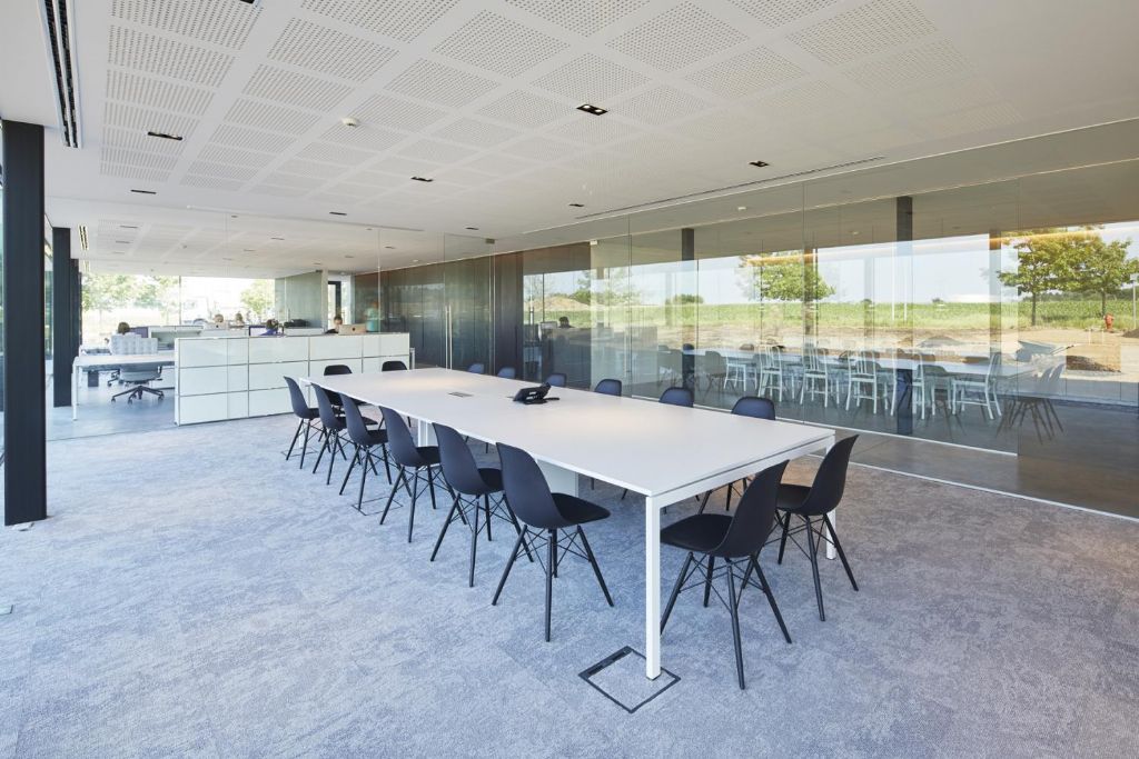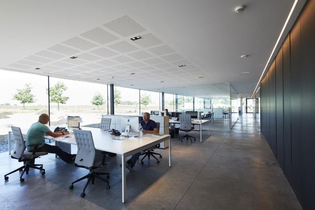 Le bâtiment n’est pas passif mais le maître d’ouvrage a souhaité dépasser les exigences minimales en matière de PEB en mettant 16 cm de polyuréthane en toiture et 12 cm en façade. L’intérieur du bâtiment traduit également les souhaits de sobriété du maître d’ouvrage. Tapis plain et béton poli au sol et stores et luminaires intégrés dans les faux-plafonds. Le chauffage par le sol et la ventilation double flux en trois ou quatre voies sont autant de détails qui reflètent le souci de finition élévé du maître d’ouvrage.